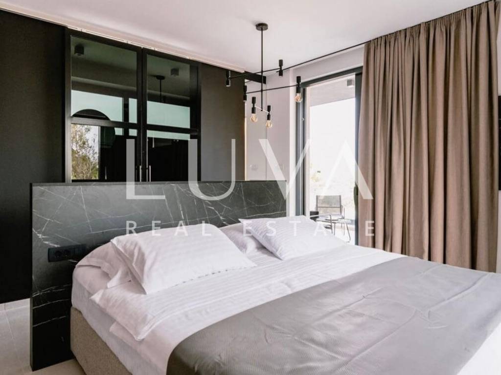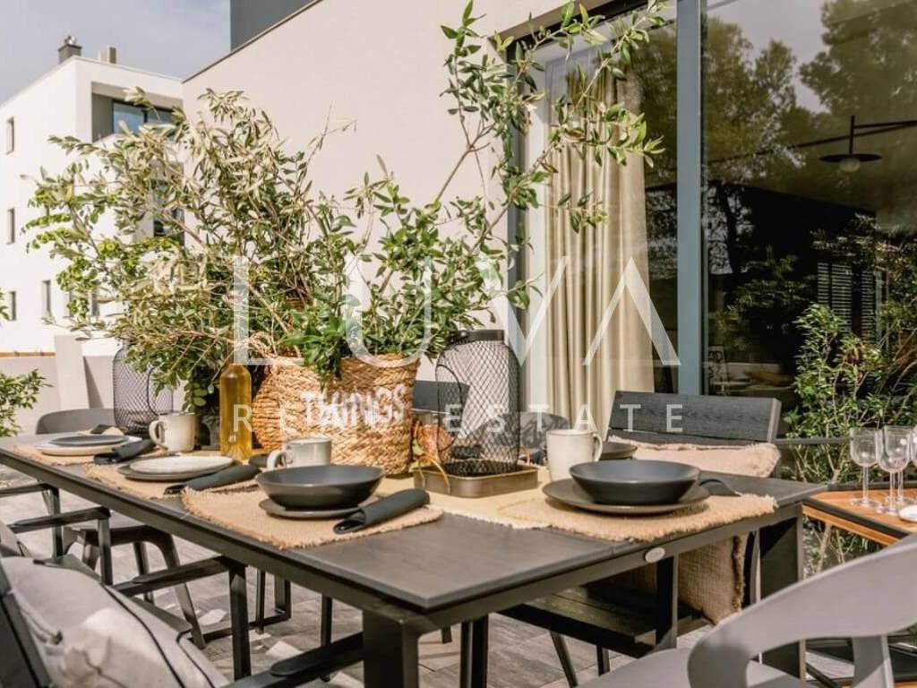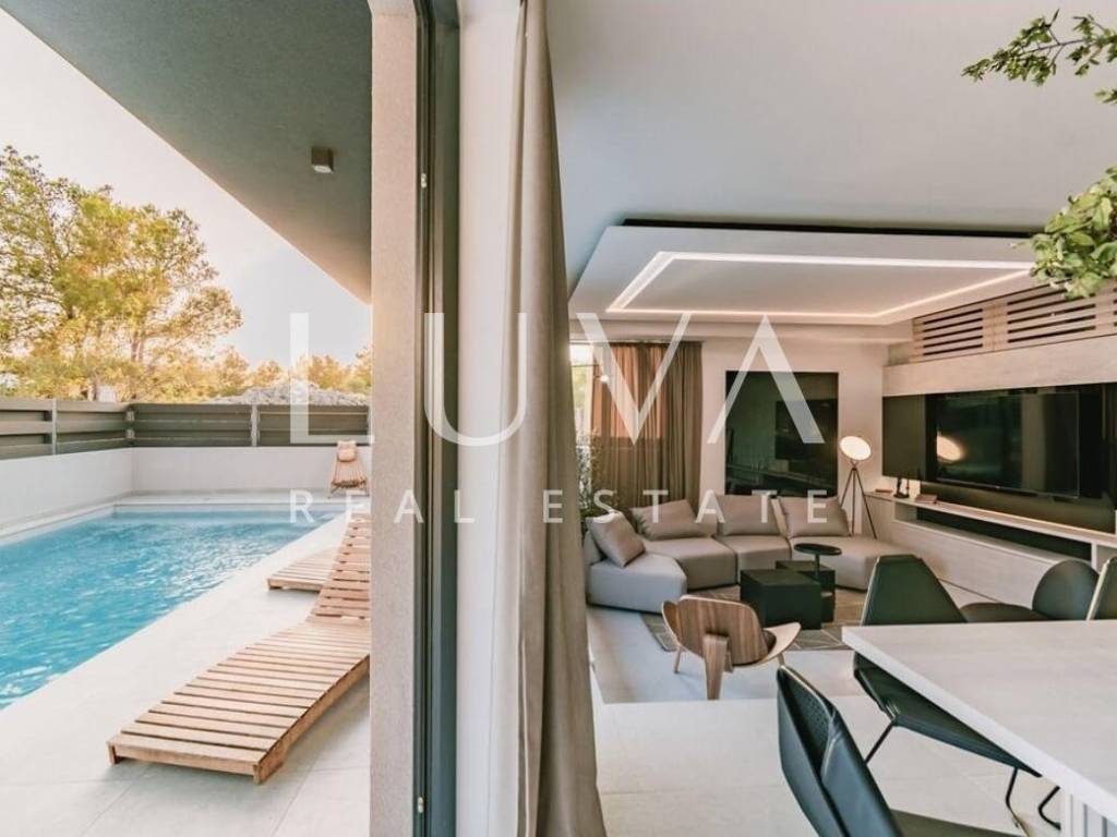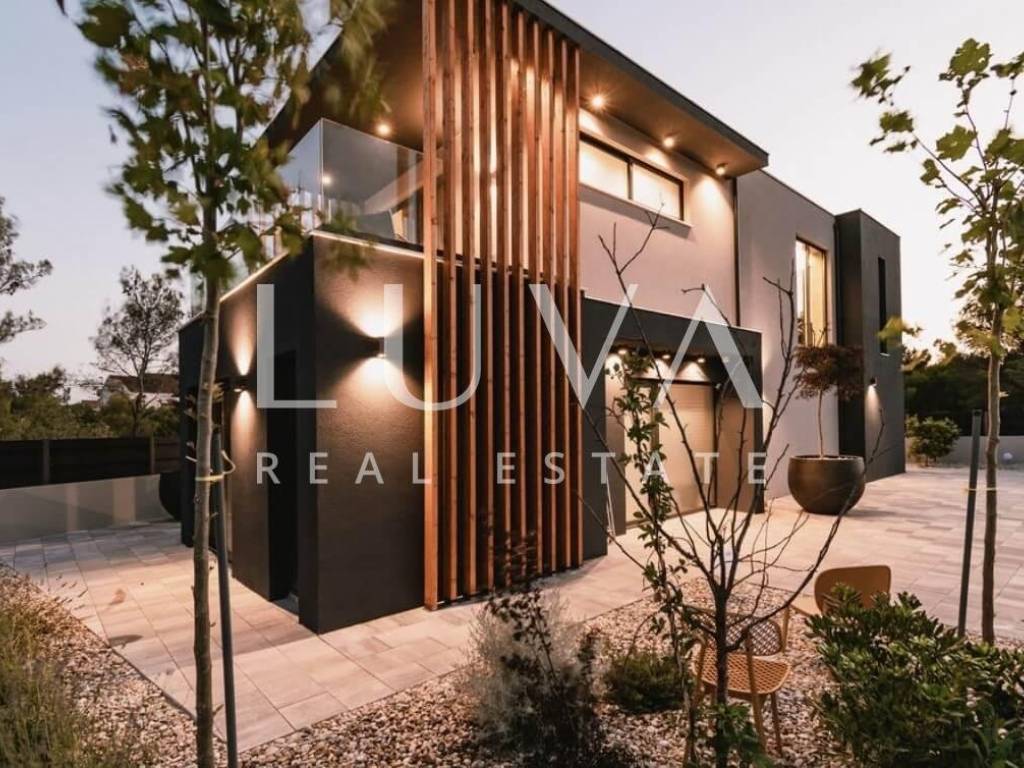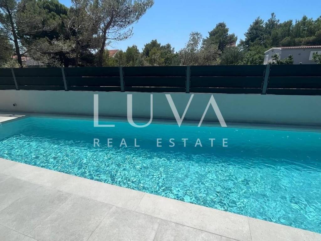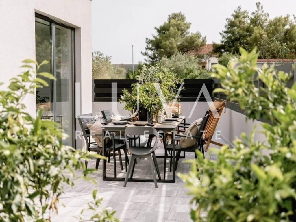 For sale: A luxury house with a pool in the quiet village of Srima, adjacent to the popular destination Vodice on the Dalmatian coast. The house is situated on a fully enclosed 200 m² estate, just a short distance from the sea. Completed in 2018, the house spans 200 m² across two floors and is designed in a modern style. In front of the house is an outdoor pool, with a Jacuzzi and dining table on the side.