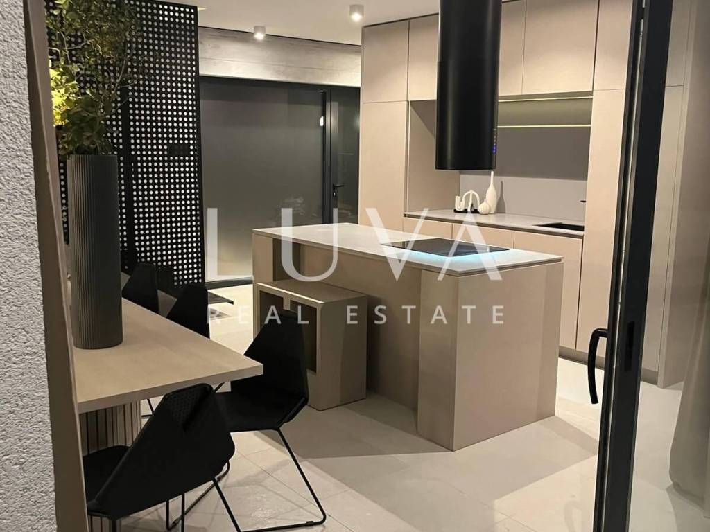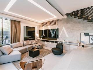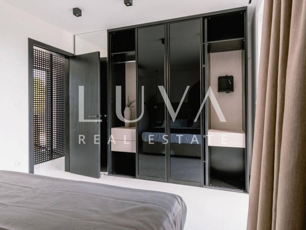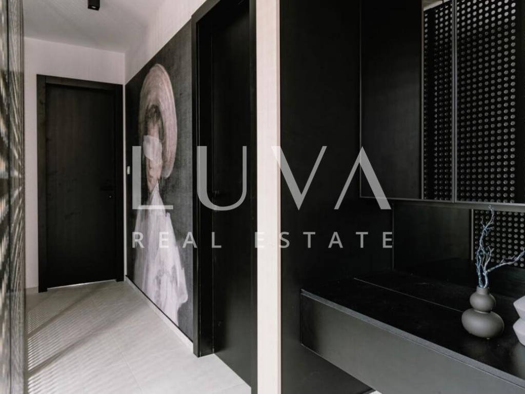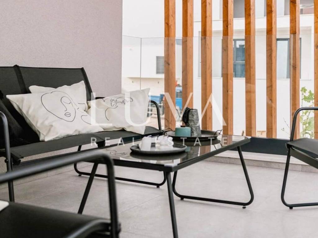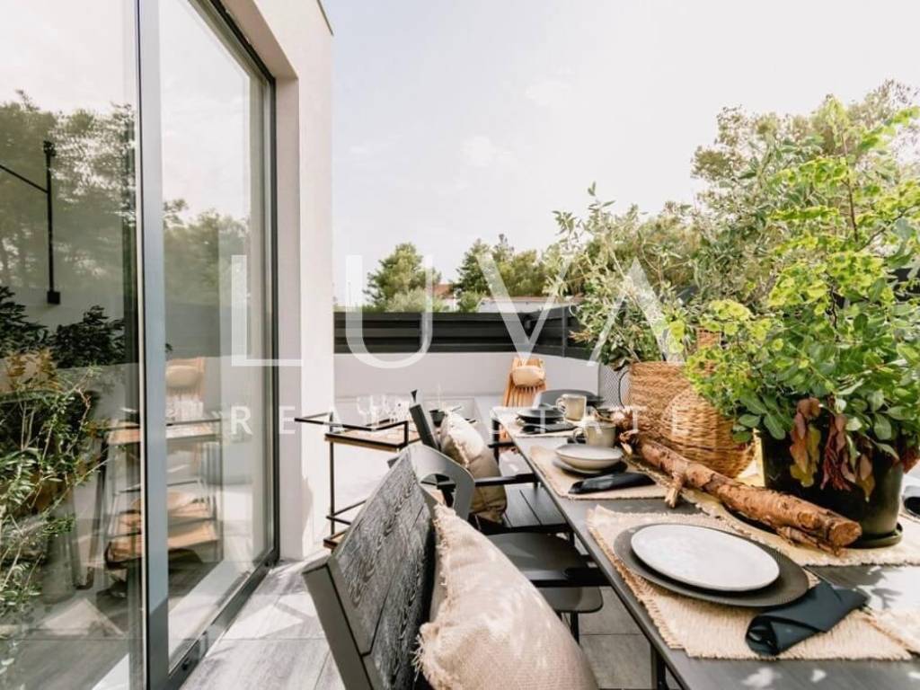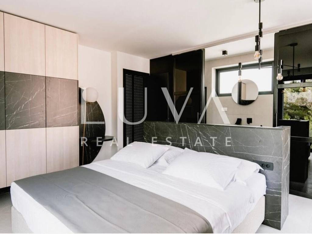 For sale: A luxury house with a pool in the quiet village of Srima, adjacent to the popular destination Vodice on the Dalmatian coast. The house is situated on a fully enclosed 200 m² estate, just a short distance from the sea. Completed in 2018, the house spans 200 m² across two floors and is designed in a modern style. In front of the house is an outdoor pool, with a Jacuzzi and dining table on the side.