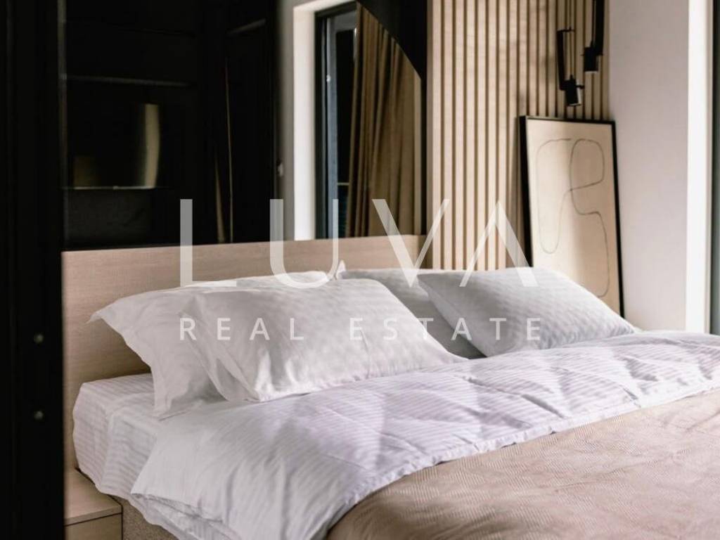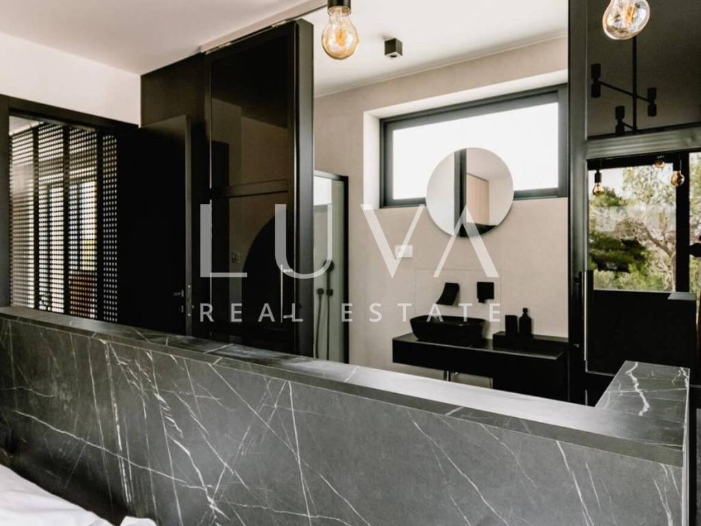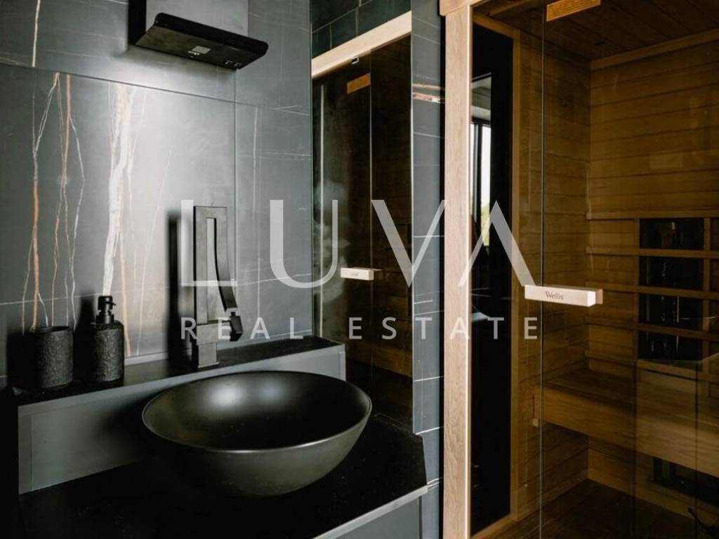 The ground floor features a fully equipped modern kitchen that opens to a living room surrounded by large glass walls, leading out to the pool area. This luxury house has 4 bedrooms, each with its own bathroom, and also includes a sauna.