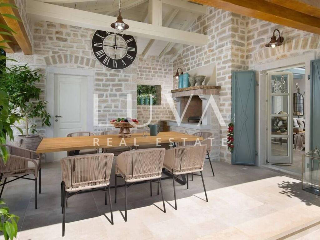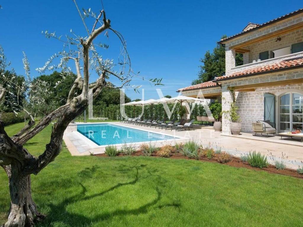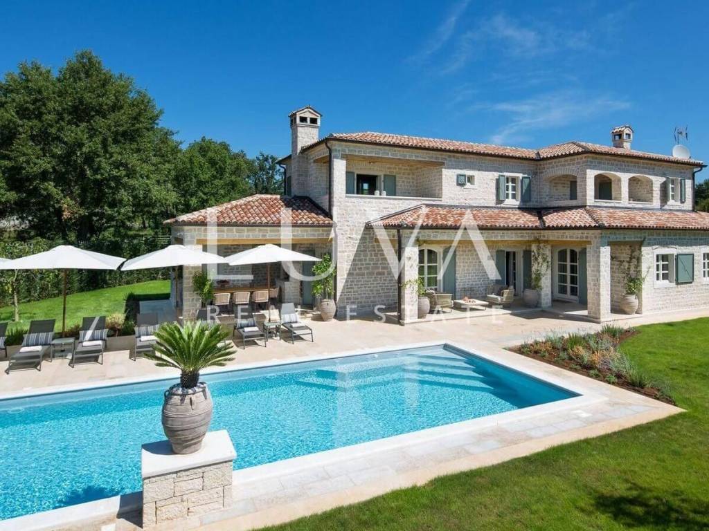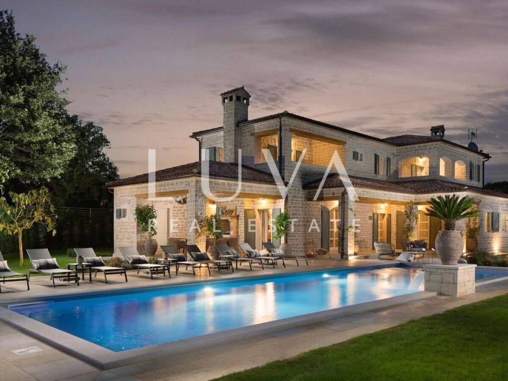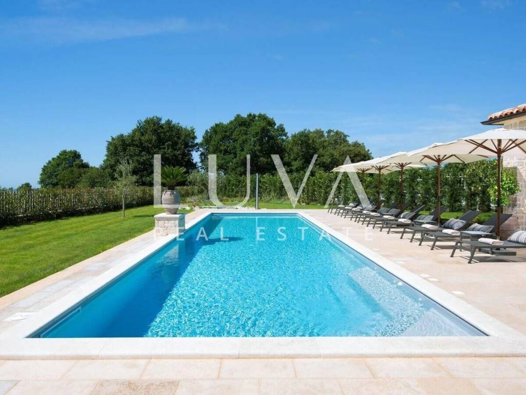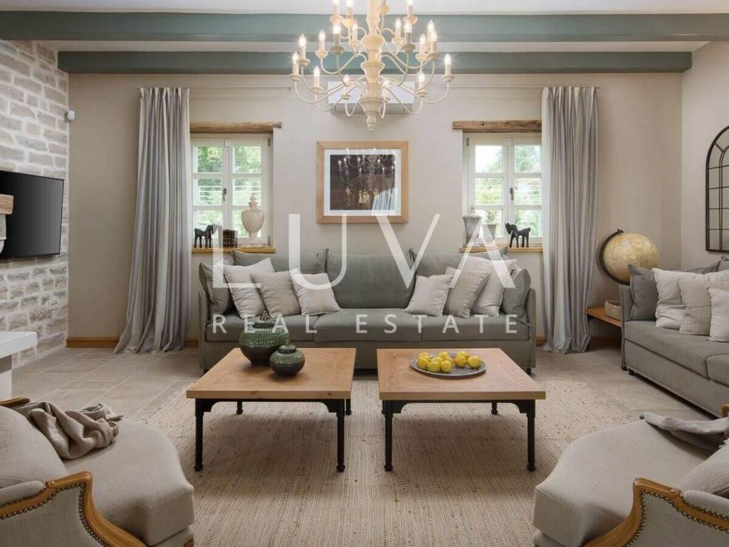 For sale: Luxury villa with a pool in the quiet village of Ladići near Kanfanar. Kanfanar is well-connected via the Istrian highway, and the famous town of Rovinj is nearby. Other notable cities such as Poreč, Novigrad, and Vrsar are also close. This luxury villa, built in 2016, has an area of 372 m² and spans two floors. It is part of a complex of luxury villas with shared sports courts and a children's playground. The villa is built in a traditional Istrian style with stone and a sloped tile roof. The interior features traditional elements with stone walls, wooden beams, and rustic wooden furniture. On the ground floor, there is a spacious living room with a charming fireplace, a fully equipped kitchen with designer appliances, and a large dining table. In front of the house, there is an outdoor pool, and next to it is a covered terrace with a barbecue and a dining table. The villa has 5 bedrooms, each with its own bathroom, and is sold fully furnished and equipped. It has been successfully rented out for tourism for several years, and its sister villas are also for sale, offering a great investment opportunity in Croatian tourism.