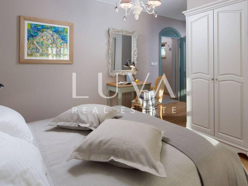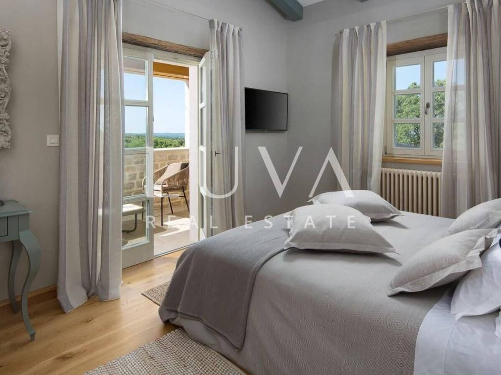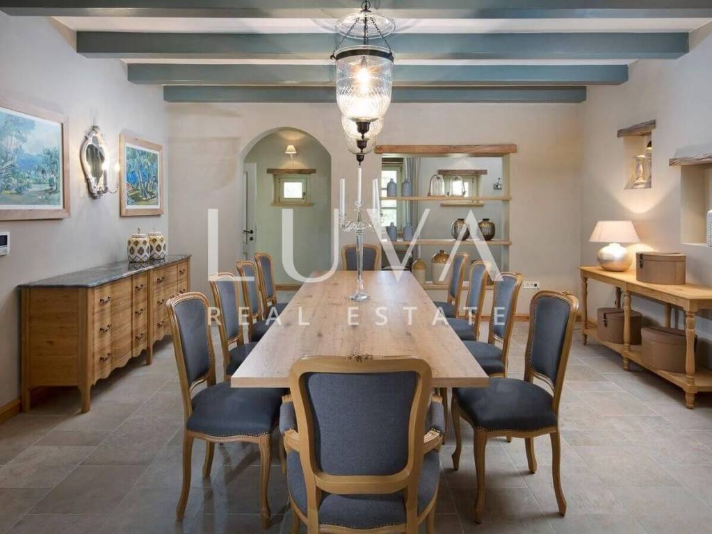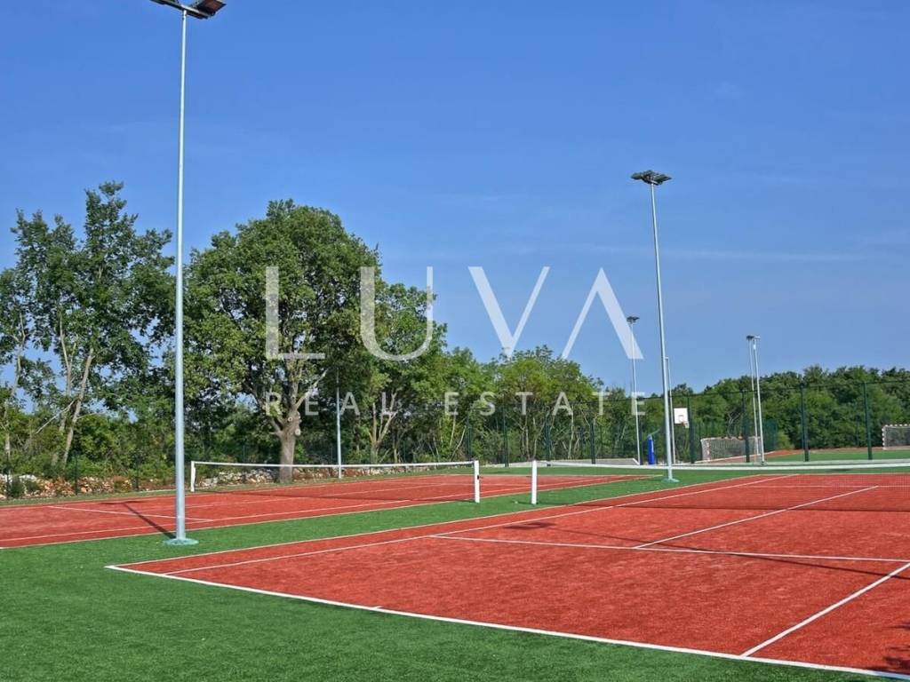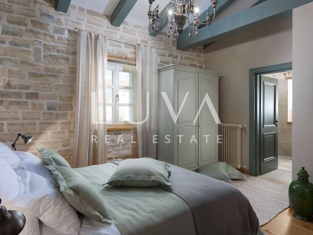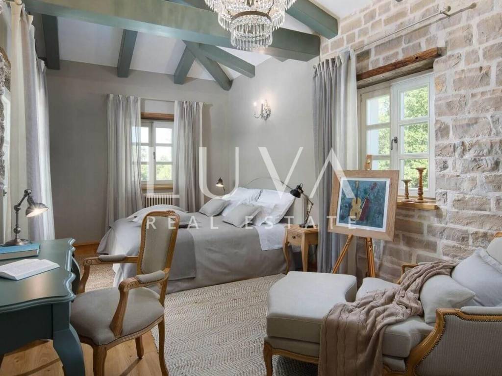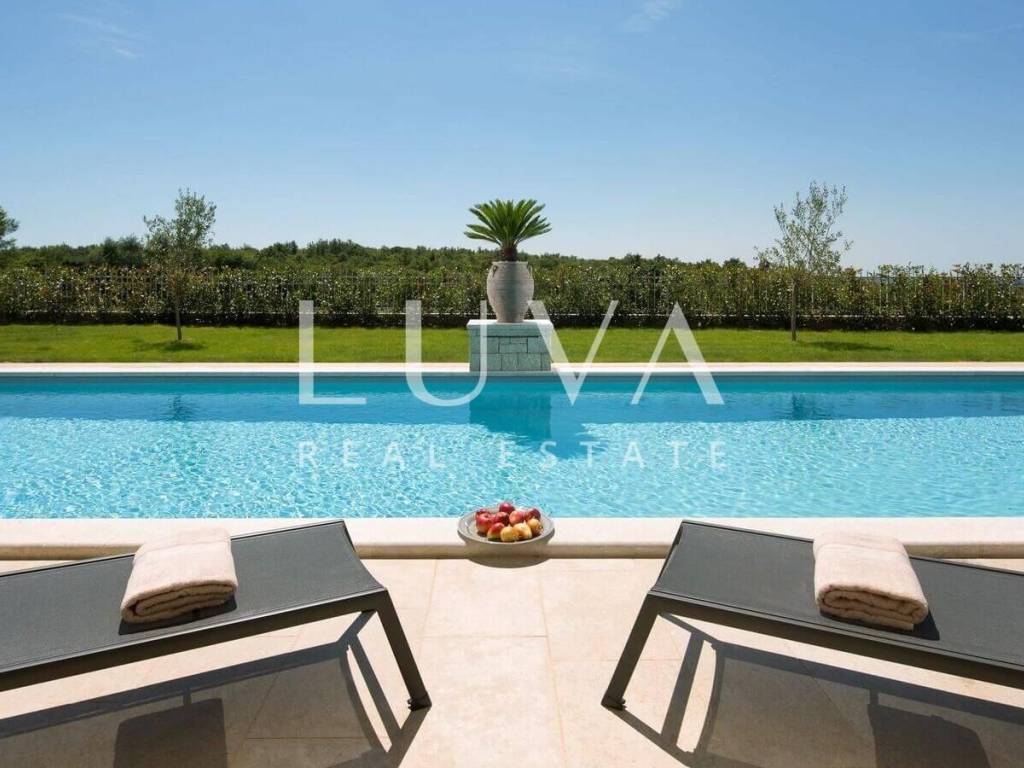 For sale: Luxury villa with a pool in the quiet village of Ladići near Kanfanar. Kanfanar is well-connected via the Istrian highway, and the famous town of Rovinj is nearby. Other notable cities such as Poreč, Novigrad, and Vrsar are also close. This luxury villa, built in 2016, has an area of 372 m² and spans two floors. It is part of a complex of luxury villas with shared sports courts and a children's playground. The villa is built in a traditional Istrian style with stone and a sloped tile roof. The interior features traditional elements with stone walls, wooden beams, and rustic wooden furniture. On the ground floor, there is a spacious living room with a charming fireplace, a fully equipped kitchen with designer appliances, and a large dining table. In front of the house, there is an outdoor pool, and next to it is a covered terrace with a barbecue and a dining table. The villa has 5 bedrooms, each with its own bathroom, and is sold fully furnished and equipped. It has been successfully rented out for tourism for several years, and its sister villas are also for sale, offering a great investment opportunity in Croatian tourism.