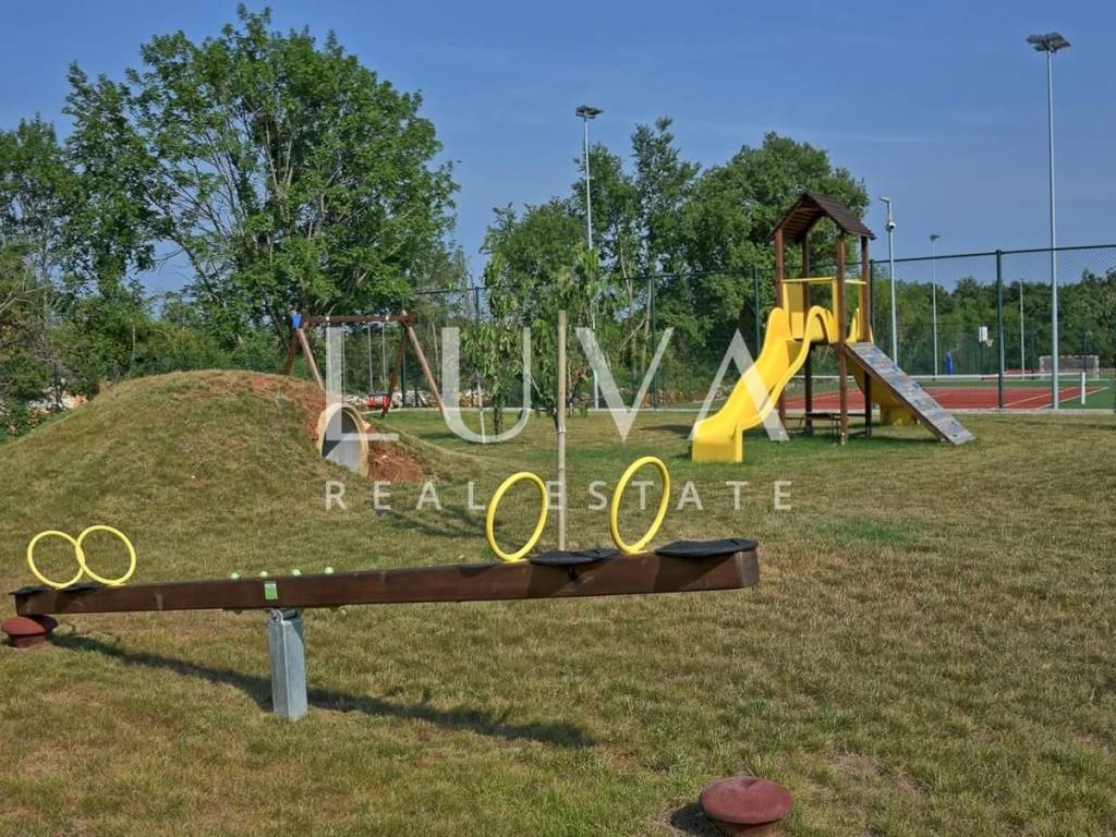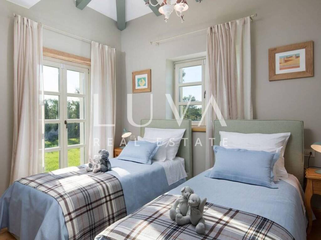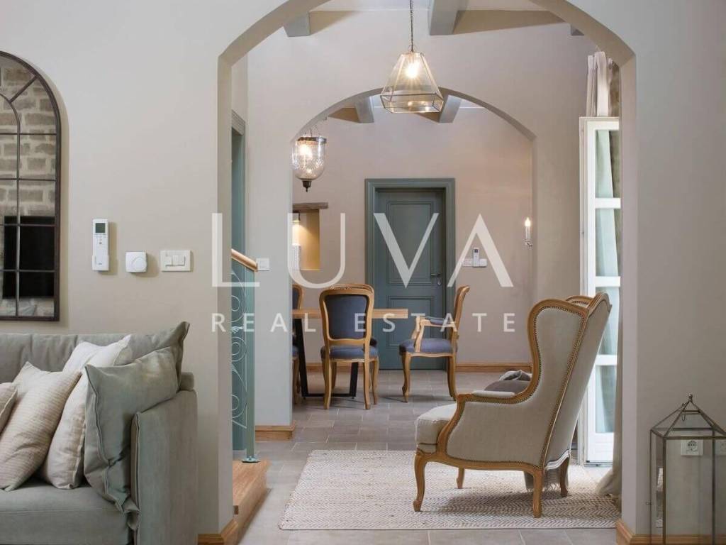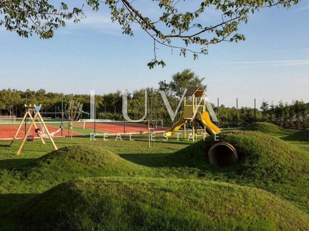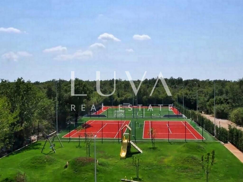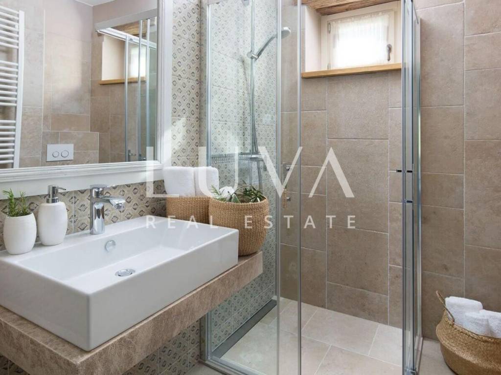For sale: Luxury villa with a pool in the quiet village of Ladići near Kanfanar. Kanfanar is well-connected via the Istrian highway, and the famous town of Rovinj is nearby. Other notable cities such as Poreč, Novigrad, and Vrsar are also close. This luxury villa, built in 2016, has an area of 372 m² and spans two floors. It is part of a complex of luxury villas with shared sports courts and a children's playground. The villa is built in a traditional Istrian style with stone and a sloped tile roof. The interior features traditional elements with stone walls, wooden beams, and rustic wooden furniture. On the ground floor, there is a spacious living room with a charming fireplace, a fully equipped kitchen with designer appliances, and a large dining table. In front of the house, there is an outdoor pool, and next to it is a covered terrace with a barbecue and a dining table. The villa has 5 bedrooms, each with its own bathroom, and is sold fully furnished and equipped. It has been successfully rented out for tourism for several years, and its sister villas are also for sale, offering a great investment opportunity in Croatian tourism.