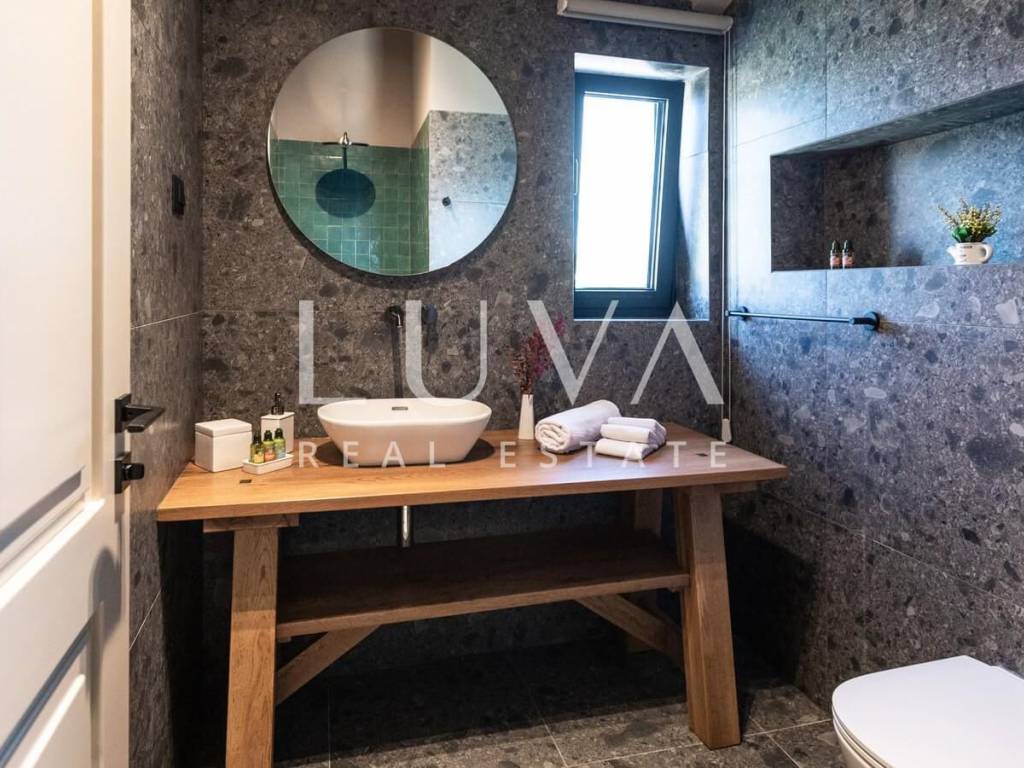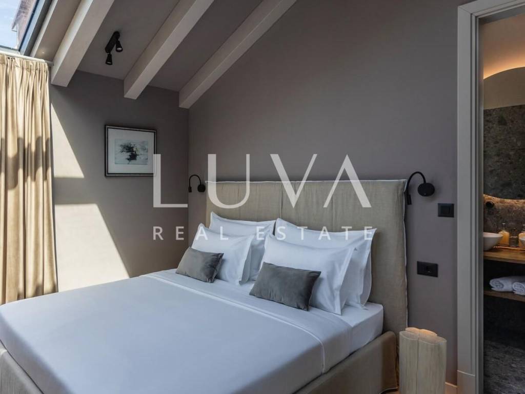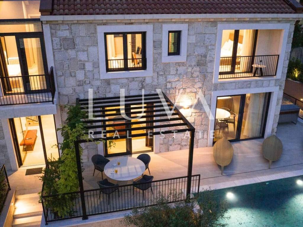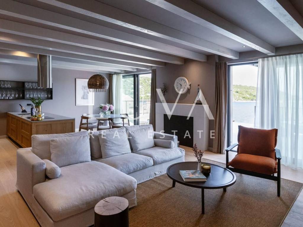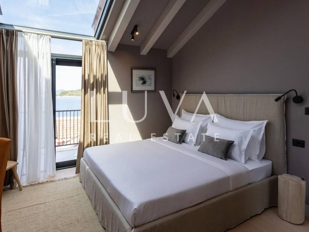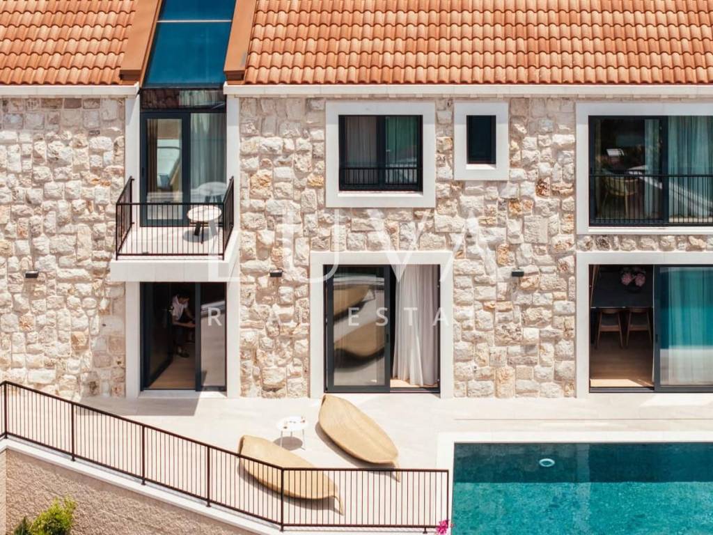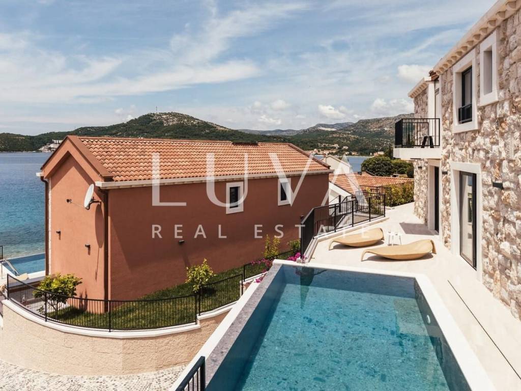 A luxury house with a pool is for sale, situated directly by the sea in the small, peaceful village of Slano near Dubrovnik. Slano is a quaint, quiet village on the coast, overlooking the island of Šipan. This luxury home is a charming stone house with a traditional sloped tile roof, perfectly blending into the area. It is literally just a few steps away from a beautiful beach and crystal-clear sea. The house has an area of 180 m2 and spans 2 floors. It is located on a 220 m2 estate, featuring an outdoor pool, a covered terrace with lounge chairs, a barbecue, and an outdoor dining table. The house has 3 bedrooms, each with its own bathroom, and a garage for 2 cars beneath the pool.