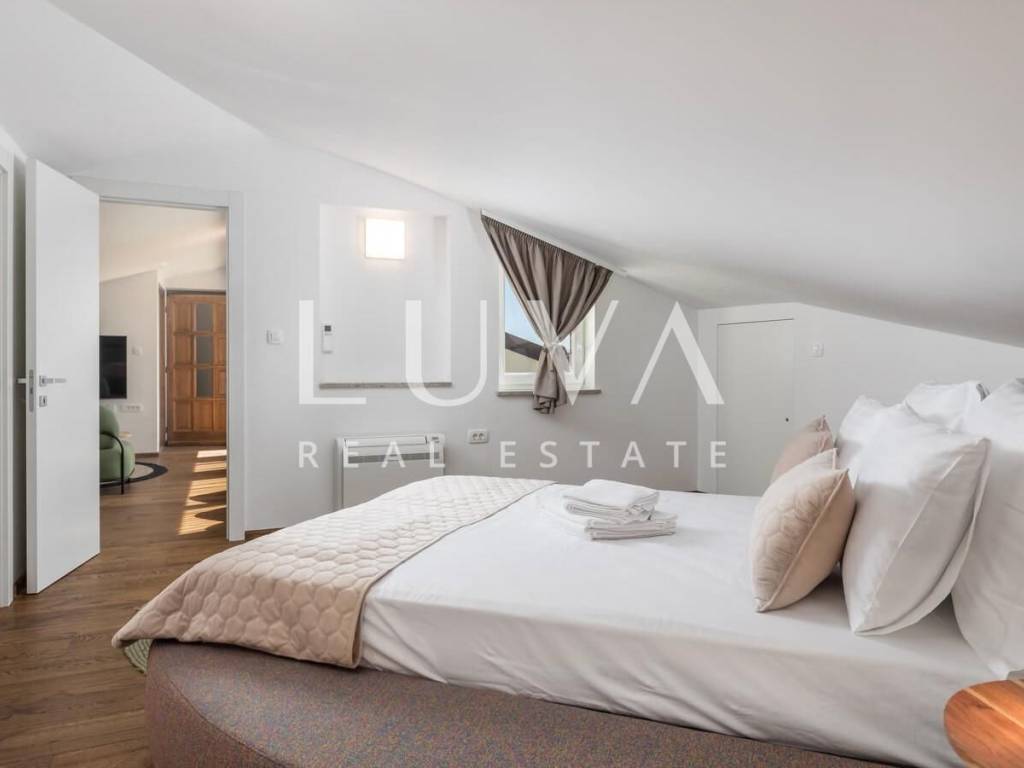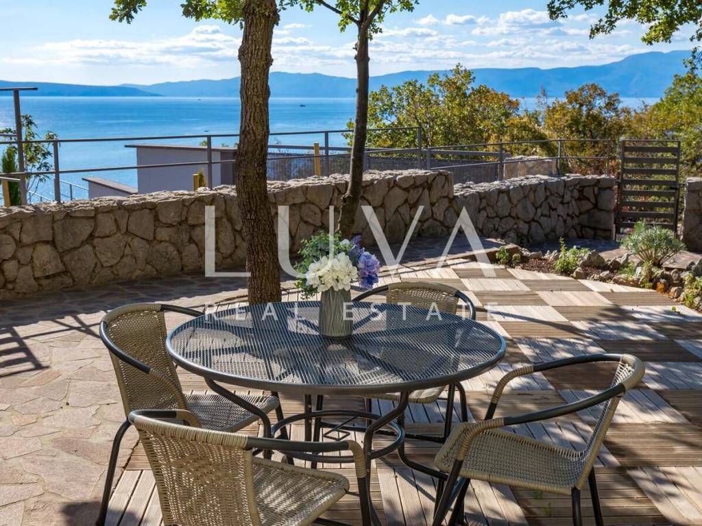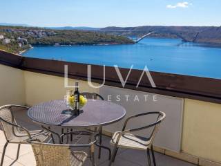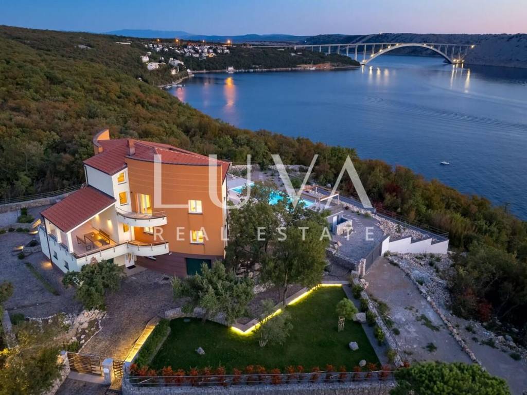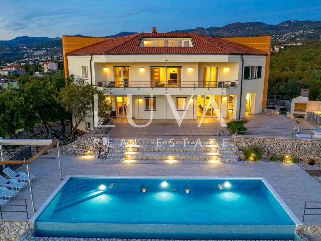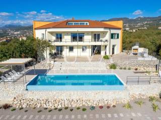 A luxury house with a pool is for sale on a large estate in a secluded area near the sea in Kraljevica. Kraljevica is a charming, quiet place near Rijeka and the island of Krk. The house is located on the edge of town, the last house next to a green belt, ensuring a lot of privacy. The spacious plot of 2,400 m2 is fully fenced and has ample parking space, as well as a garage. Situated on an elevated part, the house offers stunning panoramic views of the sea, Krk Bridge, and the island of Krk from all floors.