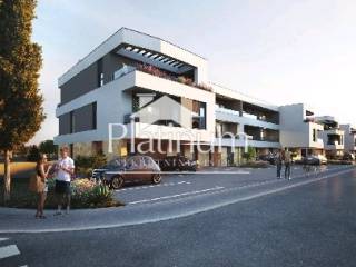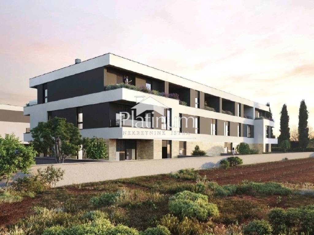 We offer an apartment on the first floor of a residential building, measuring 42.91 m2 with a total of three residential units, as part of a new residential project in a suburban settlement in the immediate vicinity of an elementary school, kindergarten, pharmacy and the city beach Hidrobaza. The apartment consists of one bedroom, hallway with wardrobe, bathroom, living room with kitchen and dining room, terrace. The apartment has one parking space - 12.50 m2 (calculated 3.12 m2) The apartment is part of a modern residential complex consisting of 19 residential buildings (10 semi-built and 9 built-in), with a total of 72 residential units. The project stands out with its modern architectural facade design, green roofs and high quality construction and equipment. Each residential unit is provided with the required number of parking spaces in accordance with the urban plan of the City of Pula, and each parking space is planned to be connected to the electricity grid for charging electric vehicles. Planned start of construction: 2026. Planned completion of construction: 2028. We are accepting reservations at this stage. Info at 00385 91 924 9486