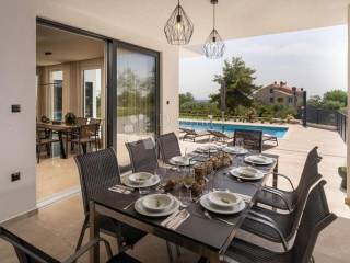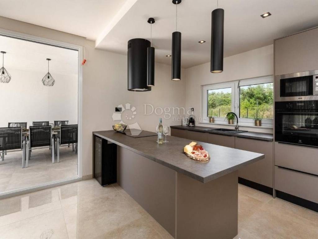 Large glass walls in the living room bring in plenty of natural light. Also, from the living room there is access to a covered terrace with a summer kitchen and barbecue. An elegant staircase leads to the first floor where there are four bedrooms, each with its own bathroom.