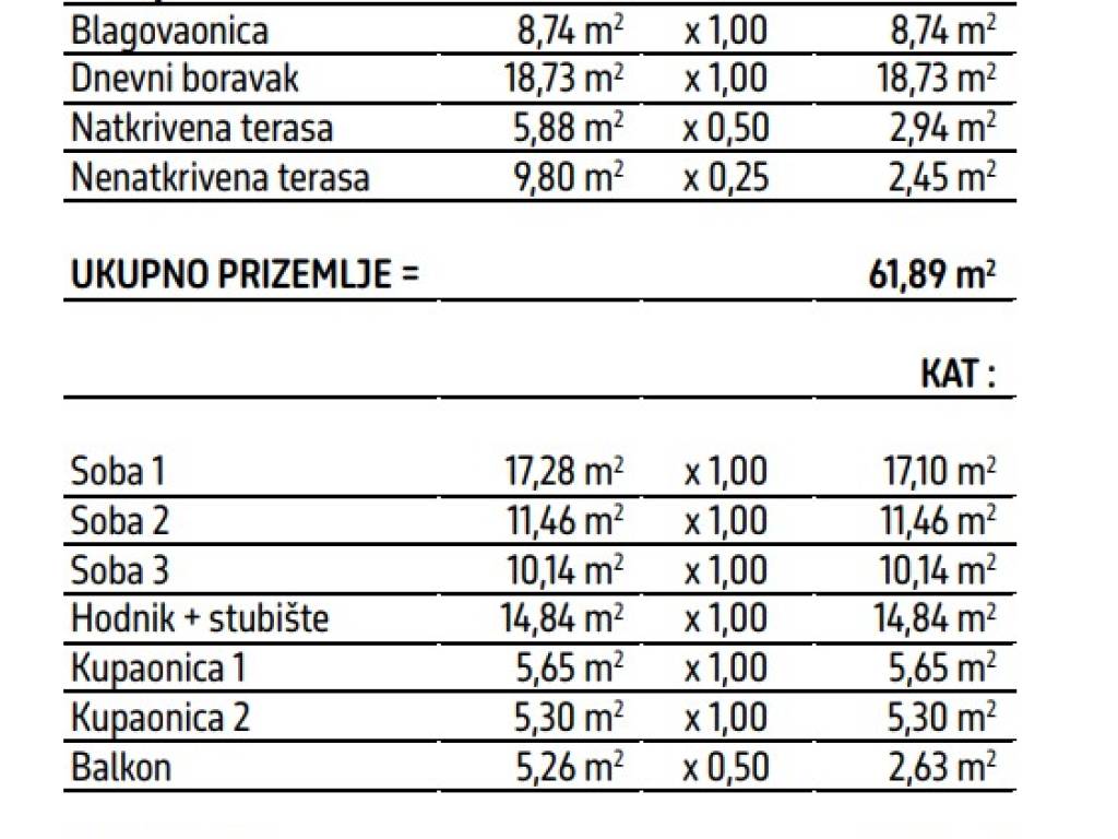 Radi se o prostranoj dvoetažnoj 4-sobnoj stambenoj jedinici ukupne prodajne površine 150,11 m. Površina stambenog dijela iznosi 129,01 m2, a sastoji se od :