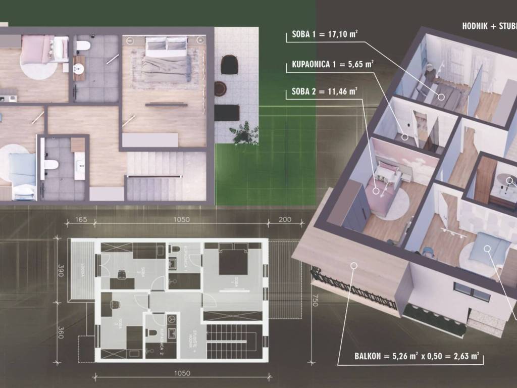 Radi se o prostranoj dvoetažnoj 4-sobnoj stambenoj jedinici ukupne prodajne površine 137,51 m. Površina stambenog dijela iznosi 129,01 a sastoji se od: