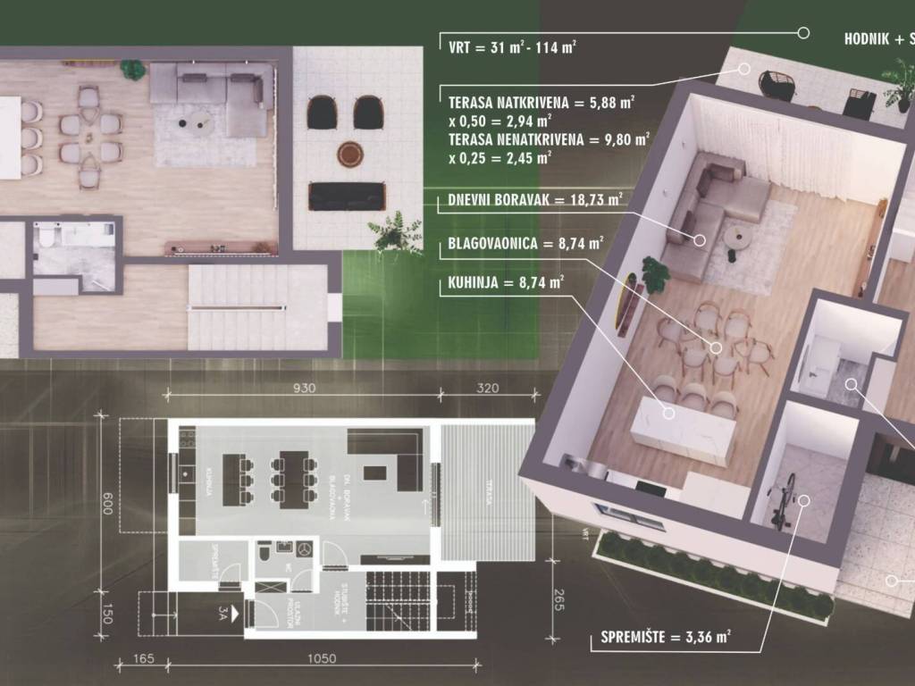 blagovaonica, dnevni boravak, natkrivena terasa površine 5,88 m2 ( neto 2,94 m2), nenatkrivena terasa površine 9,80 m2 ( neto 2,45 m2)