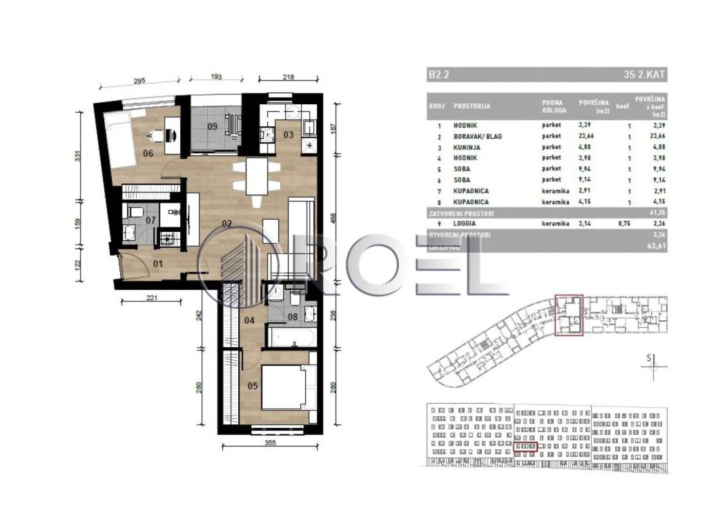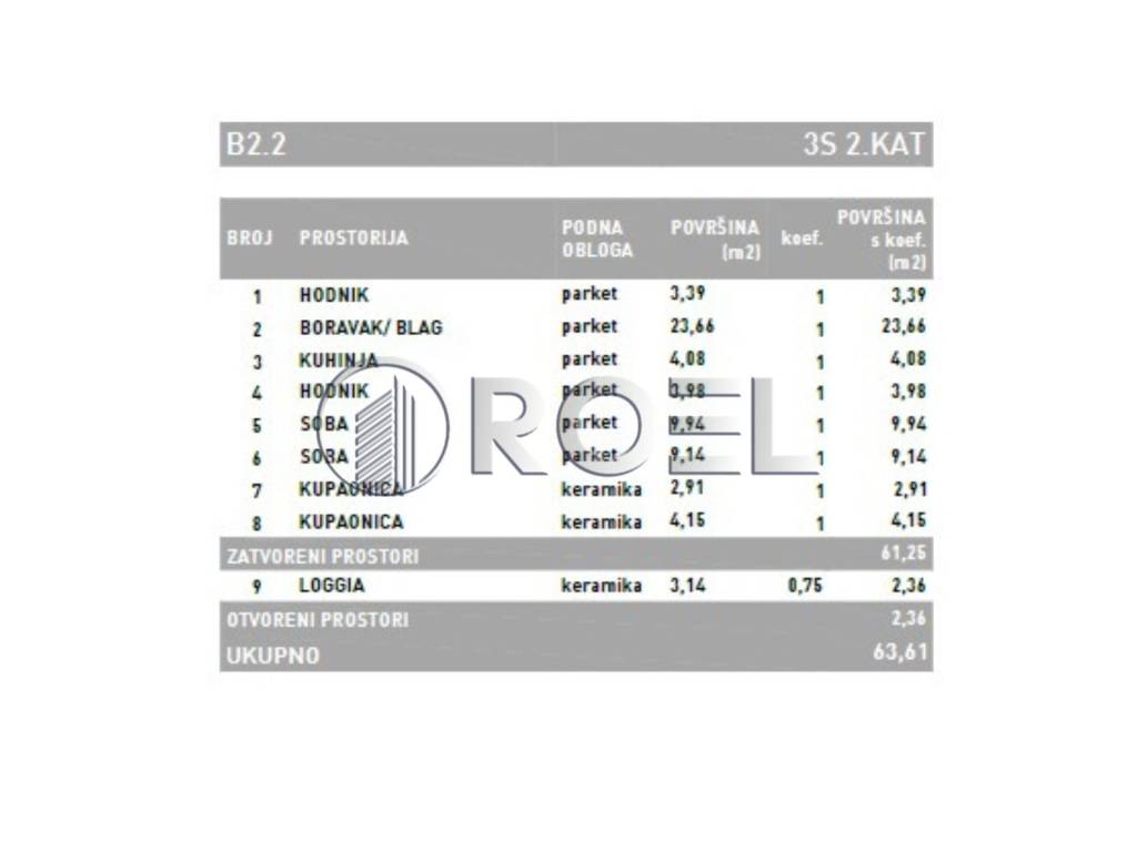 Three-bedroom apartment with a total area of 63.61 m m, located in the Dubrava district of Zagreb. Available on the first, second, third, fifth and sixth floors and on the ground floor of a building with a total of 6 floors. It consists of an entrance hall, living room with kitchen and dining room, two bedrooms, another hallway with a large built-in wardrobe, two bathrooms with a toilet and a loggia. It is oriented to the south and north.