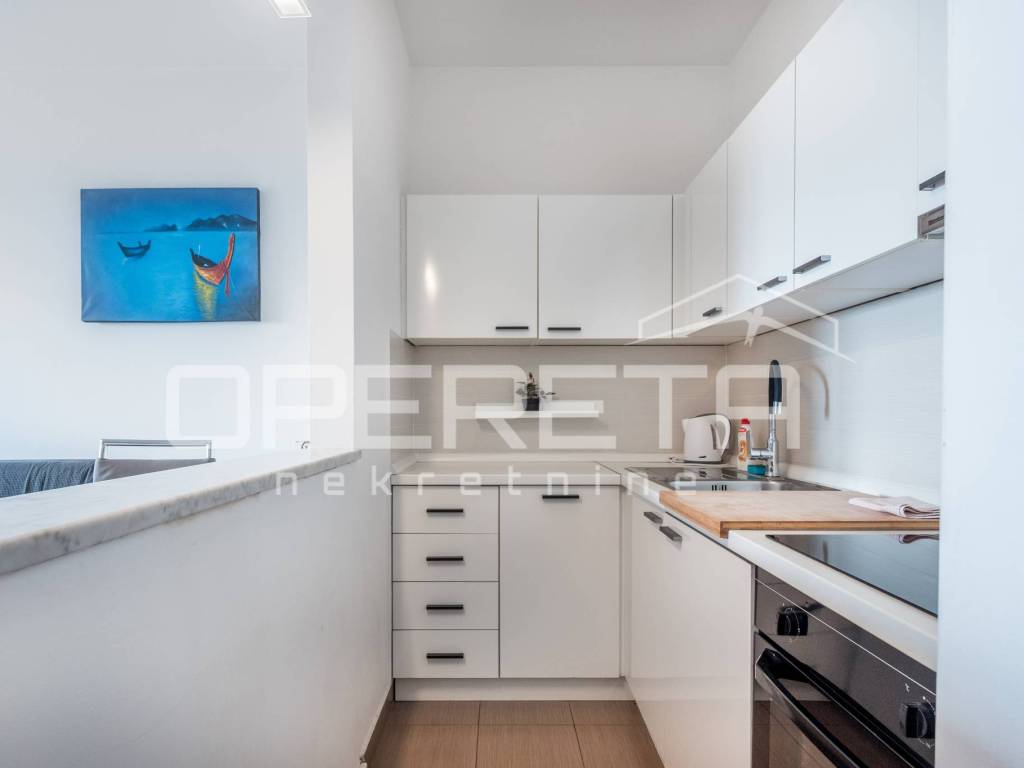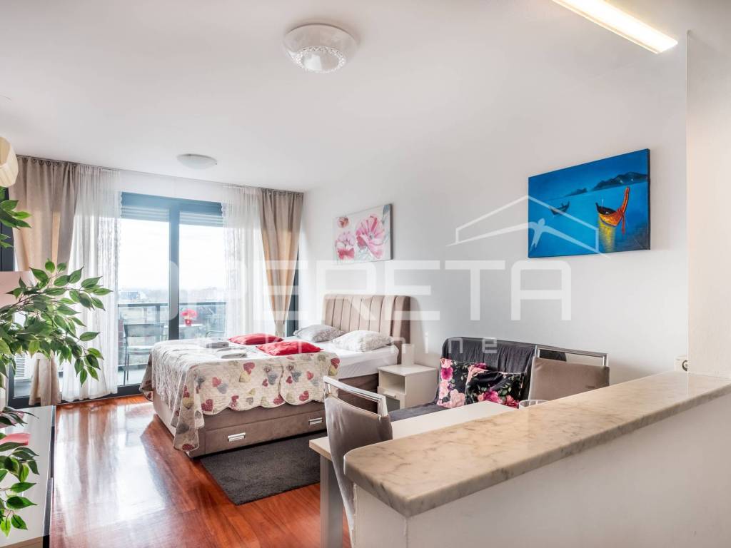 Functional layout of the apartment; bathroom, kitchen, living room/bedroom and exit to the loggia. Fully equipped with top-of-the-line appliances and modern furniture, ideal for business people, singles or couples.
