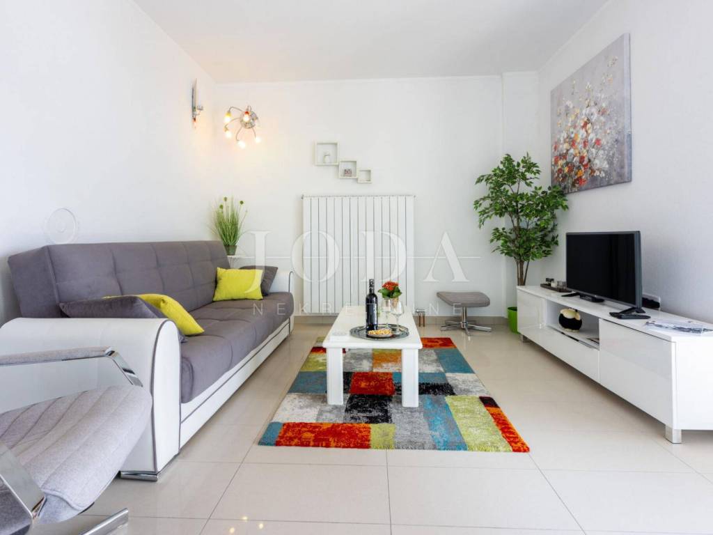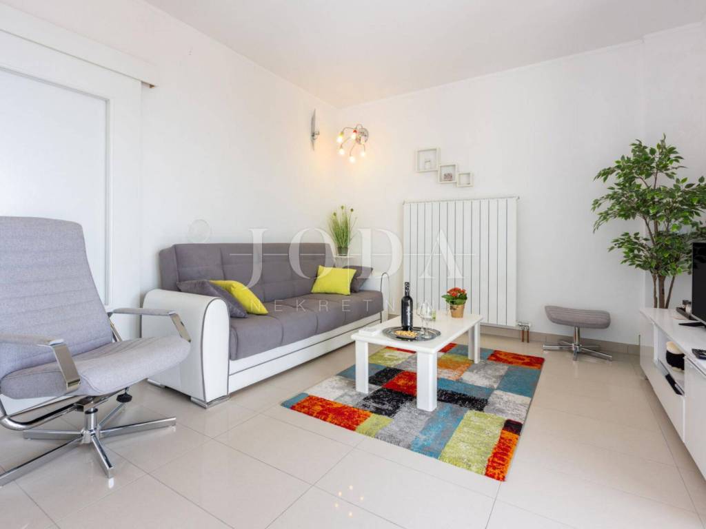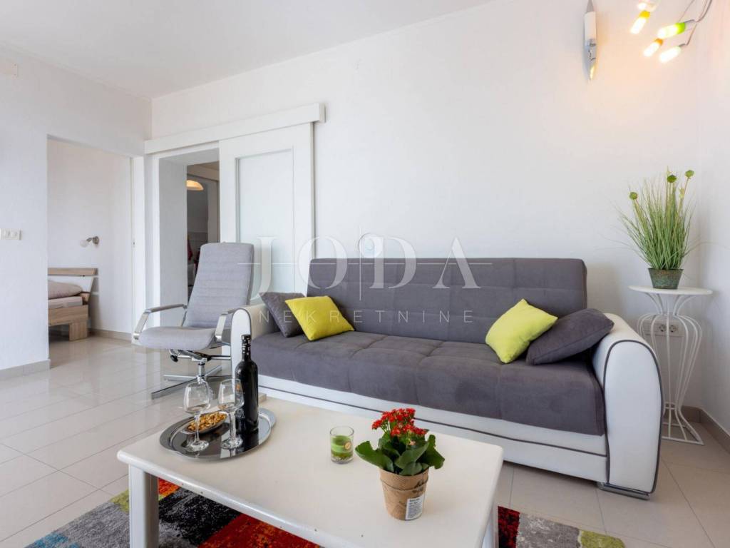 On the first floor there is a modernly furnished apartment with two bedrooms, hallway, bathroom and a large living room with panoramic sea views. The balcony on the first floor is partially covered, providing the perfect place to relax.