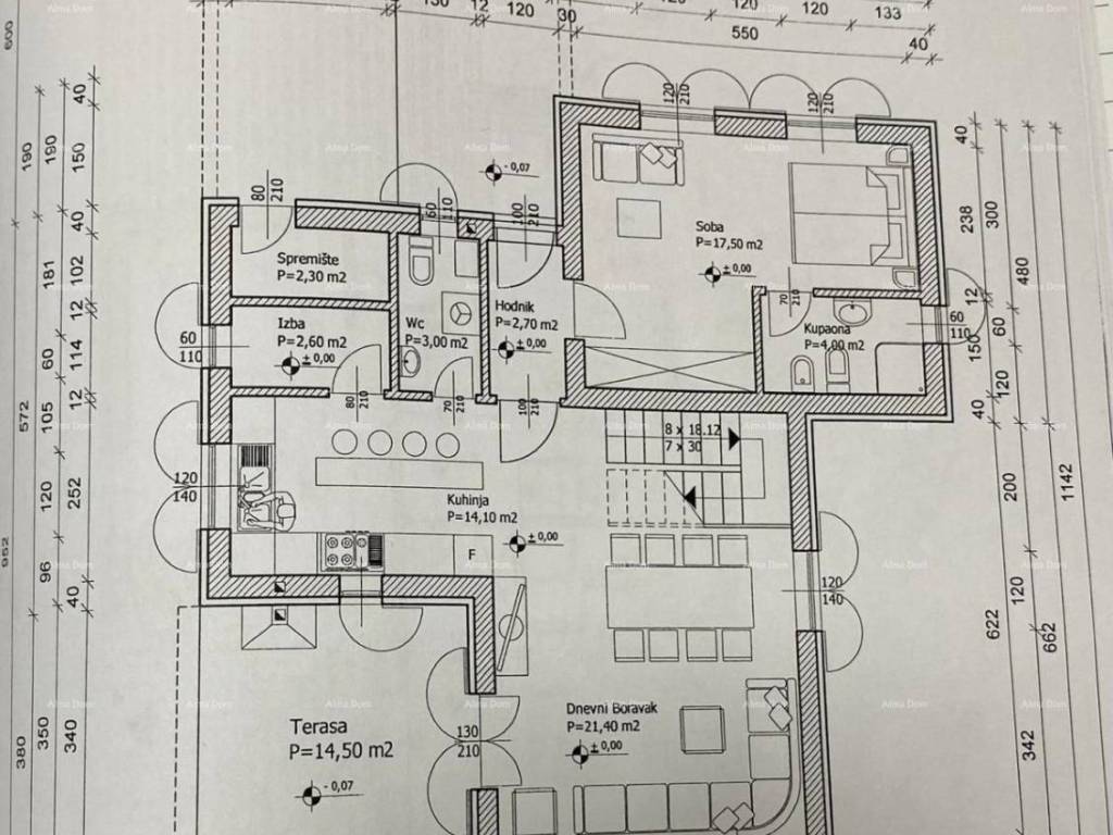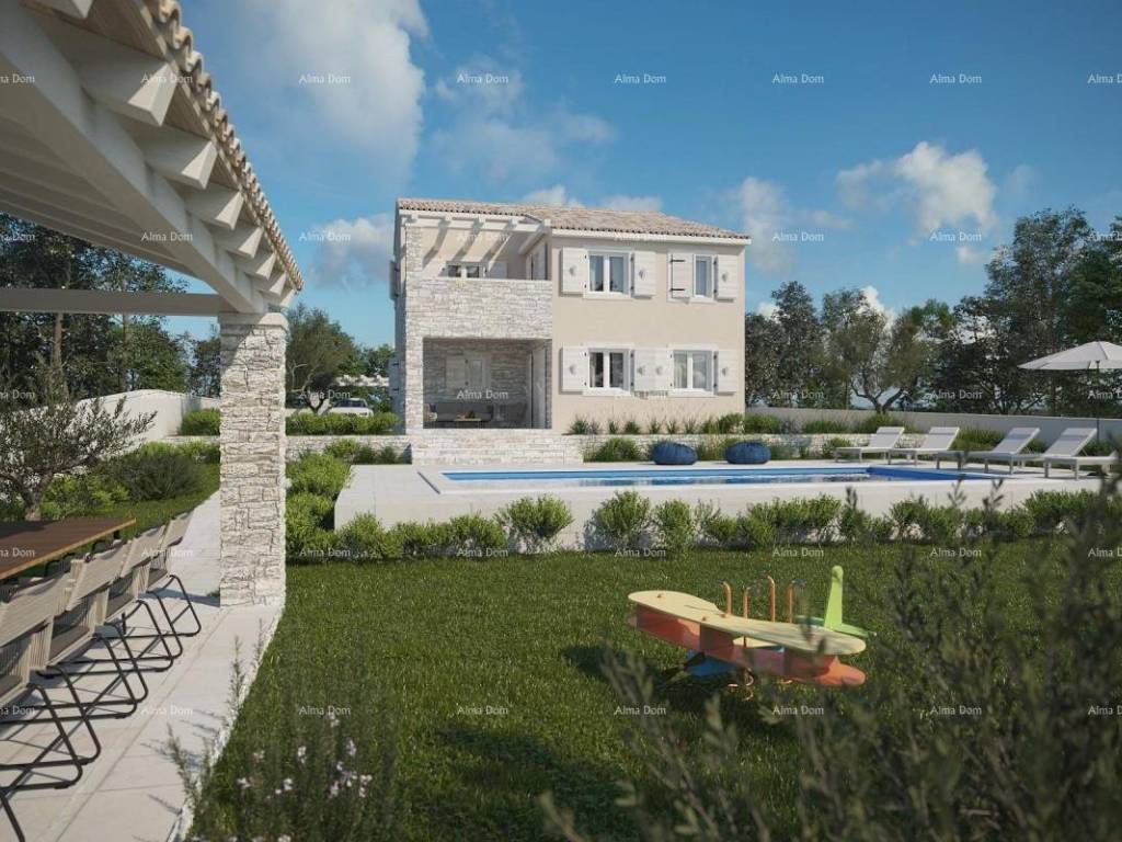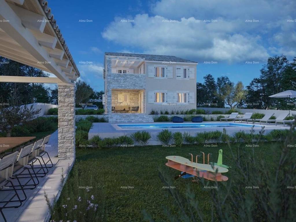 House for sale near Zminj in central Istria, On a plot of 998m2, there is a house of 195m2, on the ground floor there is a spacious living room with kitchen and dining room, pantry, small toilet and one bedroom with private bathroom, upstairs there are 3 bedrooms each with its own bathroom and exit to the terrace. pool of 37m2, summer kitchen and gazebo of 24m2.