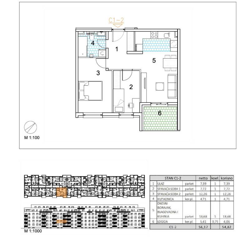 Trosoban stan površine 54,82 m2 smješten na 1. katu.Stan C1-2 sastoji se od ulaza, 2 spavaće sobe, kupaonice, dnevnog boravka, kuhinje s blagovaonicom te loggije.Velika Gorica, projekt stambene novogradnje namijenjen stalnom stanovanju, koji obuhvaća 91 stambenu jedinicu. U sklopu zgrade osigurano je ukupno 182 garažnih i parkirnih mjesta, od čega je 28 garažnih mjesta smješteno u prizemlju, 97 garažnih i parkirnih mjesta u podzemnoj etaži te dodatnih 57 parkirnih mjesta na razini terena.Uz kupnju stana obavezna je kupnja garažnog mjesta na -1 etaži po cijeni od 25.000,00 EUR ili garažnog mjesta na 0 etaži po cijeni od 30.000,00 EUR zajedno s parkirnim garažnim mjestom po cijeni od 18.000,00 EUR ili vanjskim parkirnim mjestom po cijeni od 10.000,00 EUR. Dakle, garažno mjesto na -1 etaži ili garažno mjesto na 0 etaži + garažno parkirno mjesto ili vanjsko parkirno mjesto.Građevina je projektirana kao armiranobetonska konstrukcija, međusobno povezana zidovima i gredama, s punim armiranobetonskim stropnim pločama i ravnim krovom. Vertikalni konstruktivni sustav čine armiranobetonski zidovi debljine 20 cm izvedeni kroz sve etaže, dok horizontalni sustav čine armiranobetonske ploče debljine 20 cm.Pročelje je predviđeno s toplinskom izolacijom debljine 15 cm u ETICS sustavu, izvedenom od EPS-a, a u zonama požarnih prekida, u kontaktu sa stubištem i na podgledu prizemlja od mineralne vune iste debljine. Završna obrada izvodi se armiranom mrežicom, gletanjem i završnim slojem u boji i teksturi prema projektu. Vanjska stolarija predviđena je kao PVC, u tonu definiranom projektom.Krov je projektiran kao ravni neprohodni krov, a svi slojevi izvedeni su u skladu s projektom fizike zgrade. Unutarnji pregradni zidovi izvode se kao gipskartonski, debljine 10 do 20 cm, ovisno o namjeni prostora, uz primjenu potrebne zvučne izolacije gdje je to predviđeno. Zidne površine su završno obrađene soboslikarskim radovima u boji prema projektu.Podovi u stanovima izvode se kao plivajući sustav s toplinskom izolacijom od polistirena i cementnim estrihom. Završne podne obloge predviđene su prema namjeni prostora: keramika u sanitarijama, kuhinjama i na vanjskim površinama, a troslojni hrastov parket u dnevnim boravcima, blagovaonicama, ulaznim prostorima i spavaćim sobama. U ponudi su tri varijante keramičkih pločica.Grijanje je riješeno plinskim etažnim podnim sustavom. Stanovi su opremljeni klima uređajima marke Bosch, PVC stolarijom s električnim roletama, troslojnim hrastovim parketom te sobnim vratima proizvođača RV Križevci. Ulazna vrata u stanove su protuprovalna, proizvođača Kolnoa sa sustavom zaključavanja Multilock.Useljenje 05/27Za sva pitanja Vam stojimo na raspolaganju.... Više na eurovilla.hr, ID: 197141