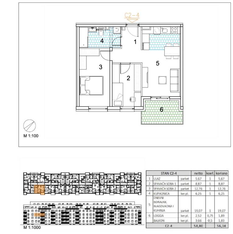 Trosoban stan površine 56,34 m2 smješten na 2. katu.Stan C2-4 sastoji se od ulaza, 2 spavaće sobe, kupaonice, dnevnog boravka, kuhinje s blagovaonicom, balkona te loggije.Velika Gorica, projekt stambene novogradnje namijenjen stalnom stanovanju, koji obuhvaća 91 stambenu jedinicu. U sklopu zgrade osigurano je ukupno 182 garažnih i parkirnih mjesta, od čega je 28 garažnih mjesta smješteno u prizemlju, 97 garažnih i parkirnih mjesta u podzemnoj etaži te dodatnih 57 parkirnih mjesta na razini terena.Uz kupnju stana obavezna je kupnja garažnog mjesta na -1 etaži po cijeni od 25.000,00 EUR ili garažnog mjesta na 0 etaži po cijeni od 30.000,00 EUR zajedno s parkirnim garažnim mjestom po cijeni od 18.000,00 EUR ili vanjskim parkirnim mjestom po cijeni od 10.000,00 EUR. Dakle, garažno mjesto na -1 etaži ili garažno mjesto na 0 etaži + garažno parkirno mjesto ili vanjsko parkirno mjesto.Građevina je projektirana kao armiranobetonska konstrukcija, međusobno povezana zidovima i gredama, s punim armiranobetonskim stropnim pločama i ravnim krovom. Vertikalni konstruktivni sustav čine armiranobetonski zidovi debljine 20 cm izvedeni kroz sve etaže, dok horizontalni sustav čine armiranobetonske ploče debljine 20 cm.Pročelje je predviđeno s toplinskom izolacijom debljine 15 cm u ETICS sustavu, izvedenom od EPS-a, a u zonama požarnih prekida, u kontaktu sa stubištem i na podgledu prizemlja od mineralne vune iste debljine. Završna obrada izvodi se armiranom mrežicom, gletanjem i završnim slojem u boji i teksturi prema projektu. Vanjska stolarija predviđena je kao PVC, u tonu definiranom projektom.Krov je projektiran kao ravni neprohodni krov, a svi slojevi izvedeni su u skladu s projektom fizike zgrade. Unutarnji pregradni zidovi izvode se kao gipskartonski, debljine 10 do 20 cm, ovisno o namjeni prostora, uz primjenu potrebne zvučne izolacije gdje je to predviđeno. Zidne površine su završno obrađene soboslikarskim radovima u boji prema projektu.Podovi u stanovima izvode se kao plivajući sustav s toplinskom izolacijom od polistirena i cementnim estrihom. Završne podne obloge predviđene su prema namjeni prostora: keramika u sanitarijama, kuhinjama i na vanjskim površinama, a troslojni hrastov parket u dnevnim boravcima, blagovaonicama, ulaznim prostorima i spavaćim sobama. U ponudi su tri varijante keramičkih pločica.Grijanje je riješeno plinskim etažnim podnim sustavom. Stanovi su opremljeni klima uređajima marke Bosch, PVC stolarijom s električnim roletama, troslojnim hrastovim parketom te sobnim vratima proizvođača RV Križevci. Ulazna vrata u stanove su protuprovalna, proizvođača Kolnoa sa sustavom zaključavanja Multilock.Useljenje 05/27Za sva pitanja Vam stojimo na raspolaganju.... Više na eurovilla.hr, ID: 198207