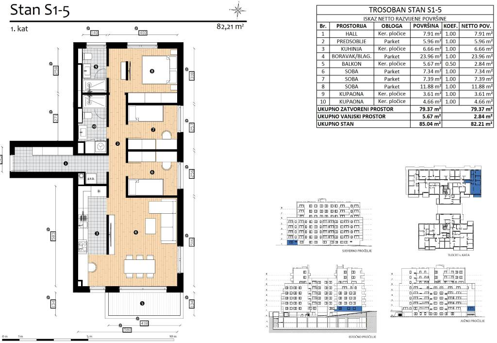HERITAGE- Nova era života na TrešnjevciTrešnjevka, na atraktivnoj lokaciji gradi se zgrada s ukupno 110 stanova. Savršen spoj udobnosti i luksuza dostupan svima. Planirano useljenje veljača 2027.Stan S1-5četverosoban stan na prvom katu zatvorene površine 79,37 m2 i loggie 5,67 m2 (2,84) ukupne površine 82,21 m2.Sastoji se od ulaznog hodnika, dnevnog boravka spojenog s blagovaonicom i kuhinjom, balkona, dvije kupaonice i tri spavaće sobe.Obavezna kupnja garažnog parkirnog mjesta i mogućnost kupnje spremišta.Zgrada će biti izgrađena po visokim standardima:sustav ETICS, završni sloj silikatna žbuka proizvođača ROFIXtoplinska izolacija 15 cm mineralna vuna Rockwoolaluminijske vanjske klupčice u boji stolarijevanjska stolarija PVC s trostrukim IZO staklomtoplinski izolirane aluminijske električne roletekomarnicidizalo KONE za 13 osoba,moderna i luksuzna kabinavideonadzor ulaza u zgradu i garažuunutarnja stolarija visina 220 cm, skriveni panti, magnetska bravaulazna vrata protuprovalna i protudimna, zvučno izoliranapodovi sanitarne prostorije, loggie i kuhinje obloženo keramičkim pločicama I klase, podovi svih ostalih prostorija obloženi sa gotovim višeslojnim hrastovim parketom proizvođača Moparsva sanitarna oprema je visoke kvalitete poznatih svjetskih proizvođača (HANSGROHE, LAUFEN, IDEAL STANDARD)ugradbeni TECE vodokotlićigrijanje i priprema potrošne tople vode preko Vaillant ili Bosch kondenzacijskog plinskog bojlerapodno grijanje svih prostorijatermostati podnog grijanja u svim prostorijamainverter klima uređaj Samsung i ToshibaLokacija u blizini škole, vrtića, trgovina, javnog gradskog prijevoza.Za sva ostala pitanja stojimo Vam na raspolaganju... Više na eurovilla.hr, ID: 221712