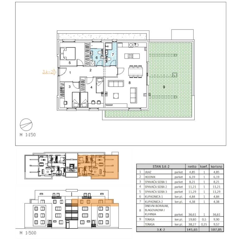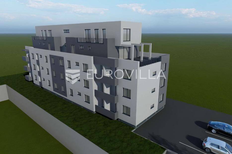 Četverosoban stan površine 107,05 m2 smješten na 3. katu.Stan 3K-1 sastoji se od ulaza, hodnika, 3 spavaće sobe, 2 kupaonice, dnevnog boravka, kuhinje s blagovaonicom te 2 terase.Projekt moderne stambene gradnje koji obuhvaća 22 stambene jedinice raspoređene u funkcionalno organiziranoj građevini, uz 36 garažnih mjesta u podzemnoj etaži i dodatnih 8 vanjskih parkirnih mjesta na razini terena. Kolni i pješački pristup omogućen je izravno s javne prometne površine na južnoj strani parcele, a promet u mirovanju riješen je u skladu s važećim urbanističkim planom, čime je osigurana jednostavna dostupnost i kvalitetna organizacija prostora.Uz kupnju stana obavezna je kupnja garažnog mjesta, kao i garažnog parkirnog mjesta ili vanjskog parkirnog mjesta uz navedeno garažno mjesto.Građevina je projektirana kao armiranobetonska konstrukcija, s nosivim zidovima i gredama međusobno povezanim u cjelovit sustav te punim armiranobetonskim stropnim i ravnim krovnim pločama. Vertikalne elemente čine armiranobetonski zidovi debljine 20 cm kroz sve etaže, dok horizontalni sustav čine armiranobetonske ploče iste debljine. Takav konstruktivni koncept osigurava stabilnost, trajnost i sigurnost objekta.Pročelje će biti izvedeno u ETICS sustavu s toplinskom izolacijom od EPS-a i mineralne vune debljine 15 cm, ovisno o poziciji i zahtjevima zaštite od požara, uz završnu obradu u boji i teksturi prema projektu. Vanjska stolarija predviđena je kao PVC, uz električno upravljane rolete, čime se dodatno doprinosi energetskoj učinkovitosti i komforu stanovanja. Ravni krov projektiran je kao neprohodan, s tehničkim slojevima definiranim elaboratom fizike zgrade.Unutarnji prostori osmišljeni su s naglaskom na funkcionalnost i dugotrajnost materijala. Sustav grijanja izveden je kao plinsko etažno podno grijanje, koje omogućuje ravnomjernu raspodjelu topline i optimalnu iskoristivost prostora bez radijatora. Za hlađenje su predviđeni klima uređaji proizvođača Bosch.Podovi se izvode kao plivajući sustav s toplinskom i zvučnom izolacijom te cementnim estrihom. U dnevnim boravcima, blagovaonicama, hodnicima i spavaćim sobama predviđen je troslojni hrastov parket, dok su u sanitarnim prostorima, kuhinjama i na vanjskim površinama planirane keramičke pločice. Kupcima će biti ponuđene tri varijante keramike u vrijednosti do 35 EUR/m², a sav dodatni odabir i eventualne izmjene moguće su putem tvrtke F.I.C. d.o.o., koja osigurava salonski odabir materijala i ugradnju.Unutarnja sobna vrata predviđena su od proizvođača RV Križevci, dok su ulazna vrata u stanove protuprovalna vrata proizvođača Kolnoa, opremljena sustavom zaključavanja Mul-T-Lock, čime je osigurana viša razina sigurnosti.Ovaj projekt u Velikoj Gorici predstavlja priliku za kupnju stana u novogradnji koja objedinjuje provjerenu konstrukcijsku kvalitetu, suvremene sustave grijanja i hlađenja te mogućnost prilagodbe završnih materijala prema željama kupca, u urbanoj zoni s dobrom prometnom povezanošću i razvijenom infrastrukturom.Useljenje: 05/2027... Više na eurovilla.hr, ID: 238067