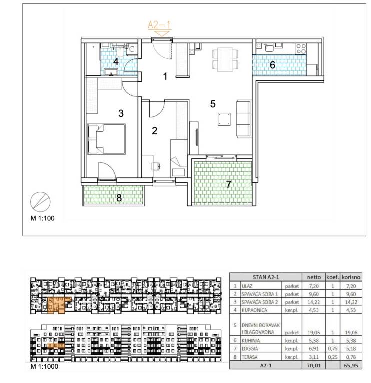 Trosoban stan površine 65,95 m2 smješten na 2. katu.Stan A2-1 sastoji se od ulaza, 2 spavaće sobe, kupaonice, dnevnog boravka, kuhinje s blagovaonicom, terase te loggije.Velika Gorica, projekt stambene novogradnje namijenjen stalnom stanovanju, koji obuhvaća 91 stambenu jedinicu. U sklopu zgrade osigurano je ukupno 182 garažnih i parkirnih mjesta, od čega je 28 garažnih mjesta smješteno u prizemlju, 97 garažnih i parkirnih mjesta u podzemnoj etaži te dodatnih 57 parkirnih mjesta na razini terena.Uz kupnju stana obavezna je kupnja garažnog mjesta na -1 etaži po cijeni od 25.000,00 EUR ili garažnog mjesta na 0 etaži po cijeni od 30.000,00 EUR zajedno s parkirnim garažnim mjestom po cijeni od 18.000,00 EUR ili vanjskim parkirnim mjestom po cijeni od 10.000,00 EUR. Dakle, garažno mjesto na -1 etaži ili garažno mjesto na 0 etaži + garažno parkirno mjesto ili vanjsko parkirno mjesto.Građevina je projektirana kao armiranobetonska konstrukcija, međusobno povezana zidovima i gredama, s punim armiranobetonskim stropnim pločama i ravnim krovom. Vertikalni konstruktivni sustav čine armiranobetonski zidovi debljine 20 cm izvedeni kroz sve etaže, dok horizontalni sustav čine armiranobetonske ploče debljine 20 cm.Pročelje je predviđeno s toplinskom izolacijom debljine 15 cm u ETICS sustavu, izvedenom od EPS-a, a u zonama požarnih prekida, u kontaktu sa stubištem i na podgledu prizemlja od mineralne vune iste debljine. Završna obrada izvodi se armiranom mrežicom, gletanjem i završnim slojem u boji i teksturi prema projektu. Vanjska stolarija predviđena je kao PVC, u tonu definiranom projektom.Krov je projektiran kao ravni neprohodni krov, a svi slojevi izvedeni su u skladu s projektom fizike zgrade. Unutarnji pregradni zidovi izvode se kao gipskartonski, debljine 10 do 20 cm, ovisno o namjeni prostora, uz primjenu potrebne zvučne izolacije gdje je to predviđeno. Zidne površine su završno obrađene soboslikarskim radovima u boji prema projektu.Podovi u stanovima izvode se kao plivajući sustav s toplinskom izolacijom od polistirena i cementnim estrihom. Završne podne obloge predviđene su prema namjeni prostora: keramika u sanitarijama, kuhinjama i na vanjskim površinama, a troslojni hrastov parket u dnevnim boravcima, blagovaonicama, ulaznim prostorima i spavaćim sobama. U ponudi su tri varijante keramičkih pločica.Grijanje je riješeno plinskim etažnim podnim sustavom. Stanovi su opremljeni klima uređajima marke Bosch, PVC stolarijom s električnim roletama, troslojnim hrastovim parketom te sobnim vratima proizvođača RV Križevci. Ulazna vrata u stanove su protuprovalna, proizvođača Kolnoa sa sustavom zaključavanja Multilock.Useljenje 05/27Za sva pitanja Vam stojimo na raspolaganju.... Više na eurovilla.hr, ID: 253137