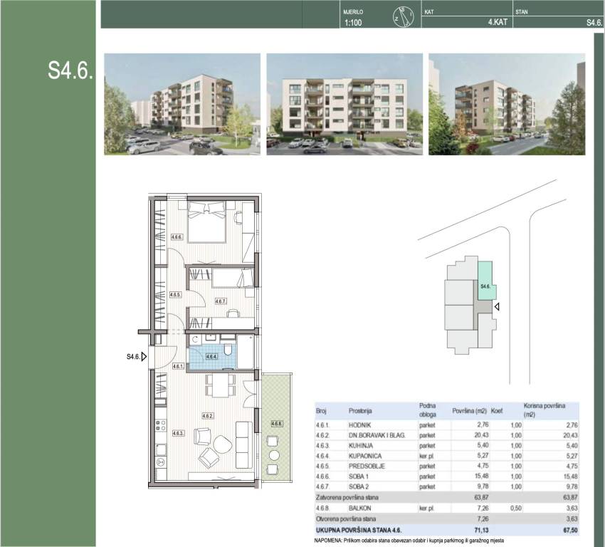 Trosoban stan na 4. katu stambene zgrade zatvorene površine 63,87 m2 s balkonom 7,26 m2 (3,63 m2), ukupno neto korisne površine 67,50 m2.Stan S-4-6 sastoji se od ulaznog prostora, dnevnog boravka s blagovaonicom, kuhinje, kupaonice, dvije spavaće sobe i natkrivenog balkona.Obavezna kupnja vanjskog ili garažnog parkirnog mjesta i ostave.Stan se nalazi u višestambenoj zgradi koji sadrži 26 moderno opremljene stambene jedinice. Moderna i kvalitetna novogradnja u mirnoj i tihoj ulici.U neposrednoj blizini nalazi se specijalna bolnica za medicinsku rehabilitaciju, Aquae Vivae - moderan vodeni park i wellness centar, trgovine, škole, vrtići i ambulante, kafići, restorani i šetnice.Useljenje 05/2027. godineOstale informacije na upit.... Više na eurovilla.hr, ID: 284546