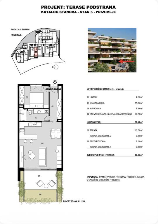 TERASE PODSTRANA | Ekskluzivan projekt novogradnje uz moreSplit - Podstrana | Luksuzna stambeno-poslovna zgrada suvremenog dizajnaProjekt TERASE u Podstrani predstavlja ekskluzivnu novogradnju smještenu na jednoj od najatraktivnijih mikrolokacija . Riječ je o luksuznoj stambeno-poslovnoj zgradi s ukupno 57 stambenih jedinica, projektiranoj i građenoj prema najvišim standardima kvalitete, s posebnim naglaskom na moderan, funkcionalan i suvremen način života. Planirano useljenje predviđeno je u drugoj polovici 2028. godine.STAN S5 - jednosoban stan smješten na etaži visokog prizemlja zgrade, zatvorene površine 59, 64 m², kojem dodatnu vrijednost daje natkrivena terase površine 13, 78 m² te privatni vrt površine 9, 23 m². Funkcionalan raspored prostora obuhvaća ulazni hodnik, jednu spavaću sobu te dnevni boravak s blagovaonicom i kuhinjom otvorenog tlocrta s izlazom na terasu i vrt.U cijenu stana uključena su dva garažna parkirna mjesta ukupne površine 30 m² te spremište površine 4 m², dok ukupna obračunska površina stana iznosi 85, 25 m². Stan će biti opremljen vrhunskom opremom koja uključuje dizalicu topline, podno grijanje cijelog stana, klimatizaciju u svim prostorijama, ALU stolariju, protuprovalna ulazna vrata, parket prve klase te visokokvalitetnu keramiku i sanitarnu opremu.Nekretnina se nalazi svega 200 metara od mora, neposredno iznad hotela Le Méridien Lav, u blizini svih potrebnih sadržaja, što ovu lokaciju čini idealnim izborom za ugodan i kvalitetan život ili investiciju.Za sve dodatne informacije stojimo na raspolaganju.... Više na eurovilla.hr, ID: 364485