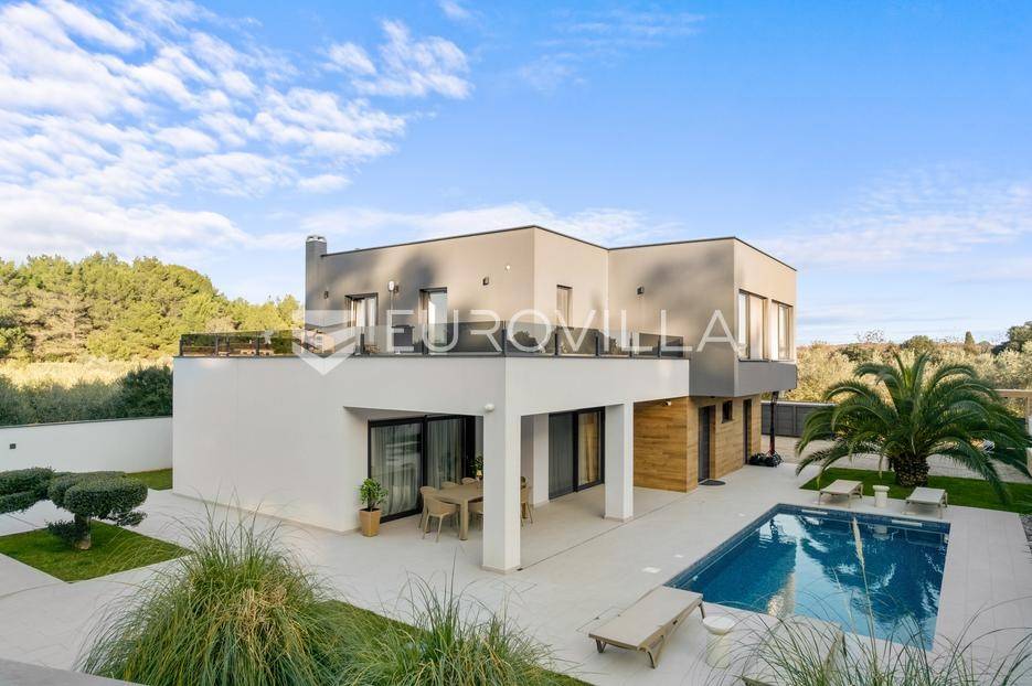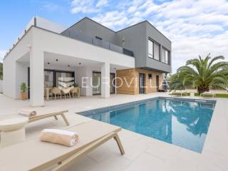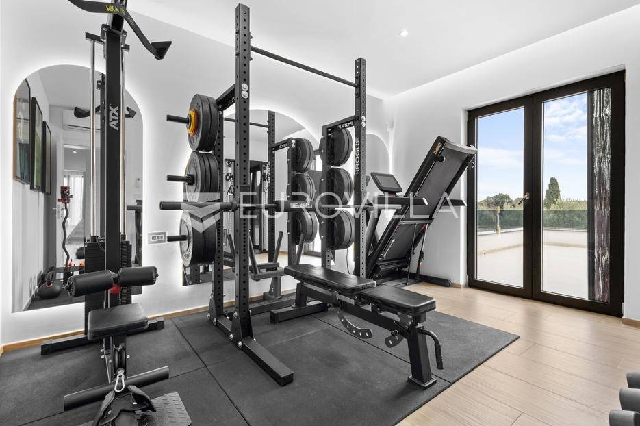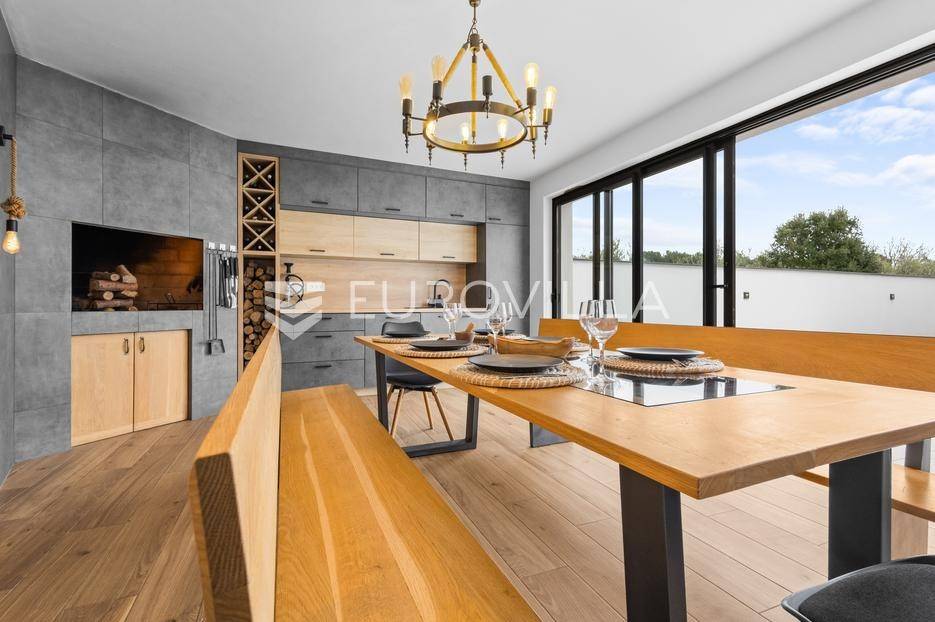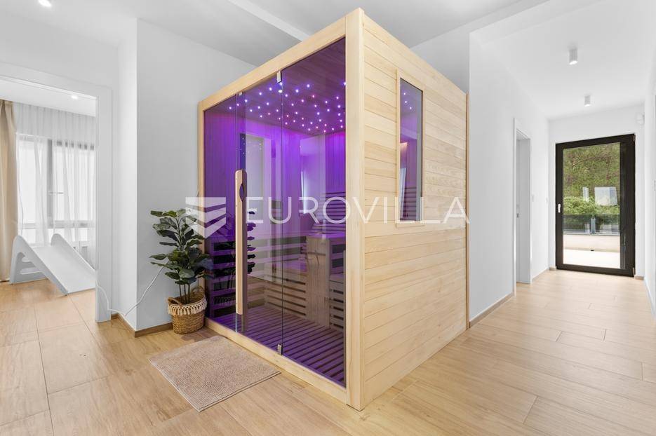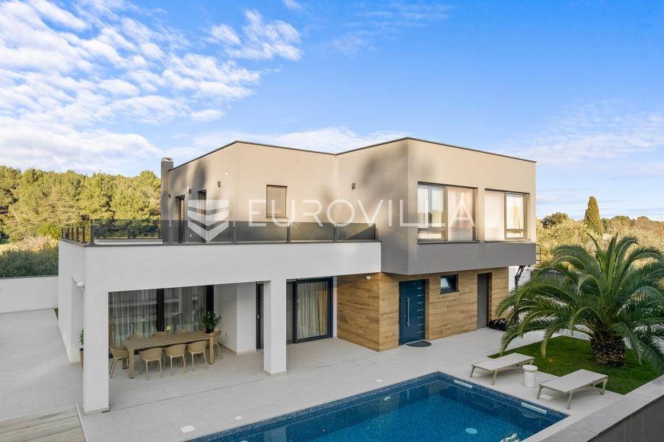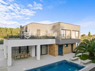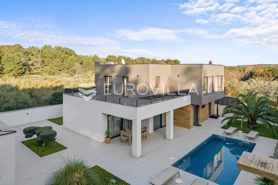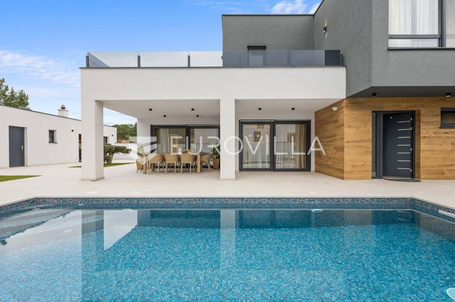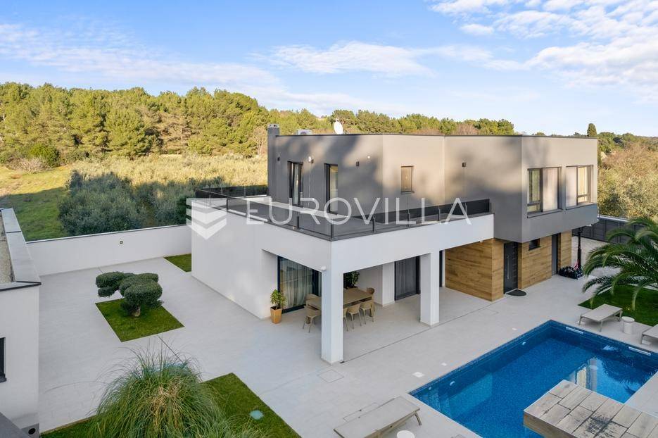 Ova iznimna moderna vila smještena je na mirnoj lokaciji naselja Veli Vrh u Puli, okružena prirodnim zelenilom koje pruža savršen zaklon od gradske užurbanosti. Izgrađena 2021. godine kao vrhunska novogradnja, nekretnina se prostire na zemljištu od 733 m2, dok njezina ukupna stambena površina iznosi 273,79 m2. Vila je pažljivo projektirana kako bi zadovoljila najviše standarde suvremenog stanovanja, kombinirajući funkcionalnost, luksuz i estetsku privlačnost u svakom kutku interijera i eksterijera.Prizemlje vile osmišljeno je kao središte dnevnog života, s impresivnim "open space" konceptom koji obuhvaća dnevni boravak, kuhinju i blagovaonicu na 48 m2. Velike staklene stijene omogućuju izlaz na natkrivenu terasu od 23 m2. U prizemlju se još nalaze elegantan ulazni hodnik, kupaonica, praonica rublja te dodatna soba koja trenutno služi kao dječja igraonica. Unutarnje stubište vodi na prvi kat gdje se nalazi glavna spavaća soba s "walk-in" garderobom, dvije dječje sobe, kupaonica te teretana i sauna od 30 m2. Poseban naglasak stavljen je na dvije prostrane krovne terase koje pružaju privatnost i dodatni prostor za opuštanje.Vanjski dio nekretnine pravi je privatni raj. Centralno mjesto zauzima grijani bazen od 32 m2 s elektrolizom soli, okružen uređenim sunčalištem. Uz bazen se nalazi šarmantna konoba od 25 m2 s kaminom, savršena za druženja. Za sigurnost i praktičnost brinu se garaža od 35 m2, dodatna tri parkirna mjesta, video nadzor te alarmni sustav.Tehnička opremljenost je besprijekorna, s podnim grijanjem na dizalicu topline i klima uređajima u svim prostorijama. Vrhunska izolacija s 9 cm mineralne vune osigurava energetsku učinkovitost, dok interijer krasi namještaj po mjeri te prvoklasna keramika. Ova nekretnina nudi savršen balans između modernog dizajna i mirnog mediteranskog okruženja.Ukoliko Vas zanima razgled ove izuzetne nekretnine, slobodno nam se obratite, stojimo Vam na raspolaganju.... Više na eurovilla.hr, ID: 375690