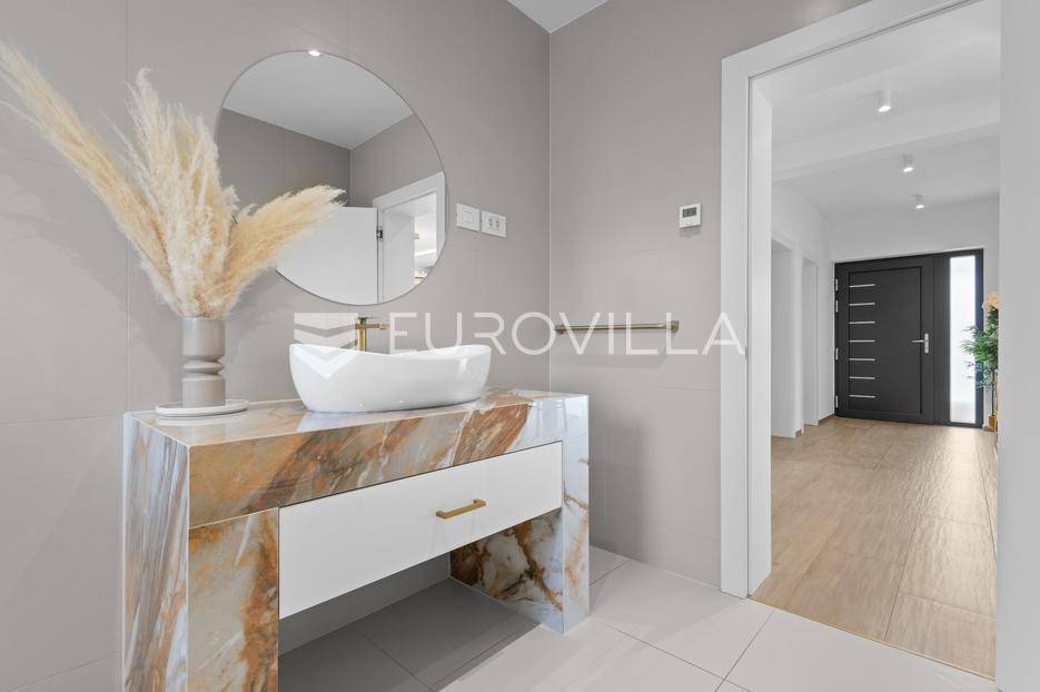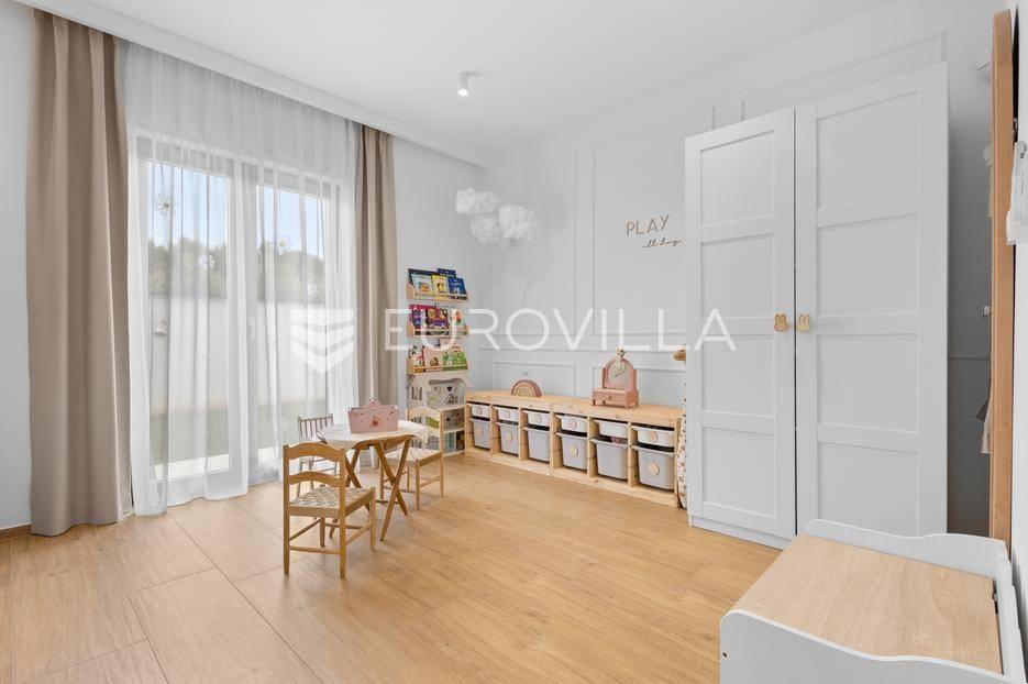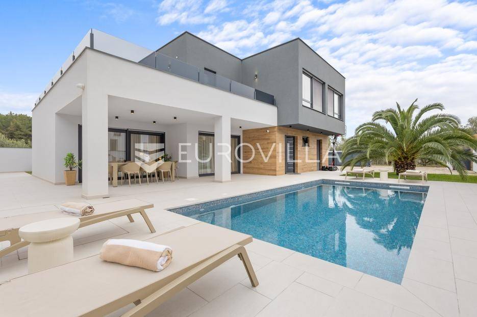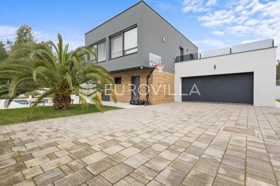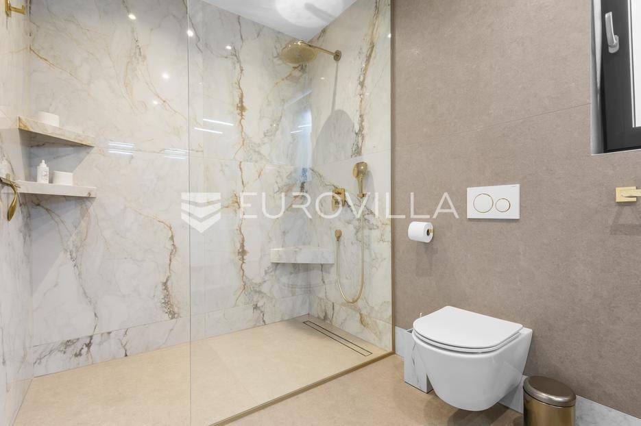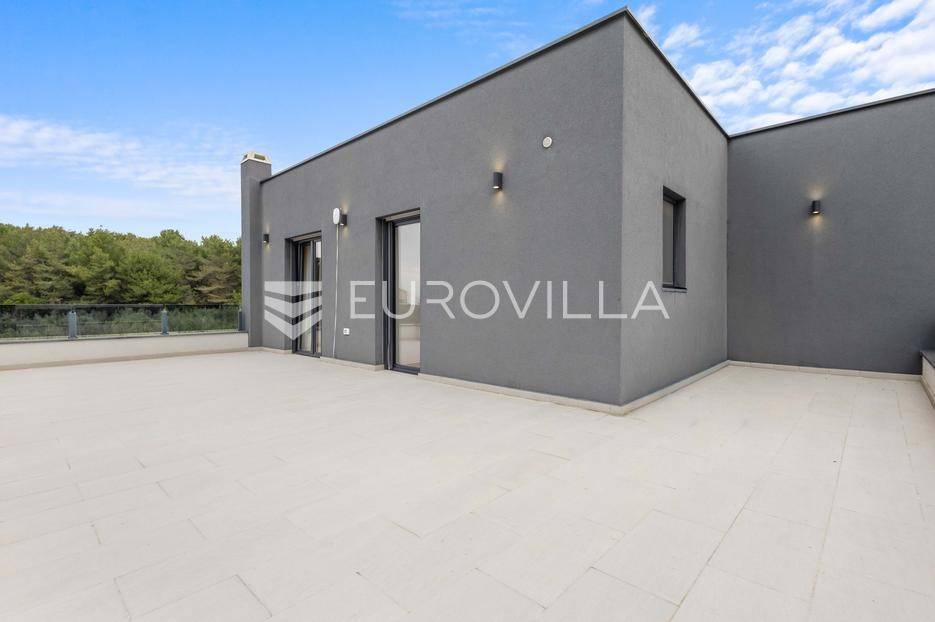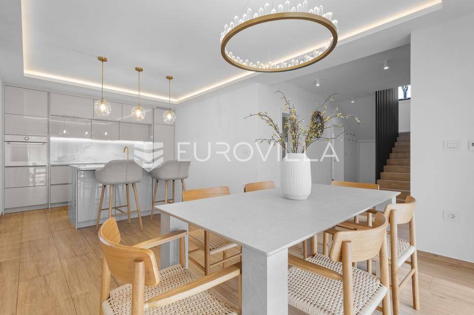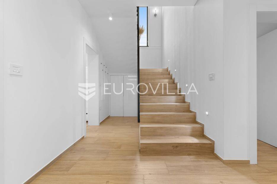 Ova iznimna moderna vila smještena je na mirnoj lokaciji naselja Veli Vrh u Puli, okružena prirodnim zelenilom koje pruža savršen zaklon od gradske užurbanosti. Izgrađena 2021. godine kao vrhunska novogradnja, nekretnina se prostire na zemljištu od 733 m2, dok njezina ukupna stambena površina iznosi 273,79 m2. Vila je pažljivo projektirana kako bi zadovoljila najviše standarde suvremenog stanovanja, kombinirajući funkcionalnost, luksuz i estetsku privlačnost u svakom kutku interijera i eksterijera.Prizemlje vile osmišljeno je kao središte dnevnog života, s impresivnim "open space" konceptom koji obuhvaća dnevni boravak, kuhinju i blagovaonicu na 48 m2. Velike staklene stijene omogućuju izlaz na natkrivenu terasu od 23 m2. U prizemlju se još nalaze elegantan ulazni hodnik, kupaonica, praonica rublja te dodatna soba koja trenutno služi kao dječja igraonica. Unutarnje stubište vodi na prvi kat gdje se nalazi glavna spavaća soba s "walk-in" garderobom, dvije dječje sobe, kupaonica te teretana i sauna od 30 m2. Poseban naglasak stavljen je na dvije prostrane krovne terase koje pružaju privatnost i dodatni prostor za opuštanje.Vanjski dio nekretnine pravi je privatni raj. Centralno mjesto zauzima grijani bazen od 32 m2 s elektrolizom soli, okružen uređenim sunčalištem. Uz bazen se nalazi šarmantna konoba od 25 m2 s kaminom, savršena za druženja. Za sigurnost i praktičnost brinu se garaža od 35 m2, dodatna tri parkirna mjesta, video nadzor te alarmni sustav.Tehnička opremljenost je besprijekorna, s podnim grijanjem na dizalicu topline i klima uređajima u svim prostorijama. Vrhunska izolacija s 9 cm mineralne vune osigurava energetsku učinkovitost, dok interijer krasi namještaj po mjeri te prvoklasna keramika. Ova nekretnina nudi savršen balans između modernog dizajna i mirnog mediteranskog okruženja.Ukoliko Vas zanima razgled ove izuzetne nekretnine, slobodno nam se obratite, stojimo Vam na raspolaganju.... Više na eurovilla.hr, ID: 375690