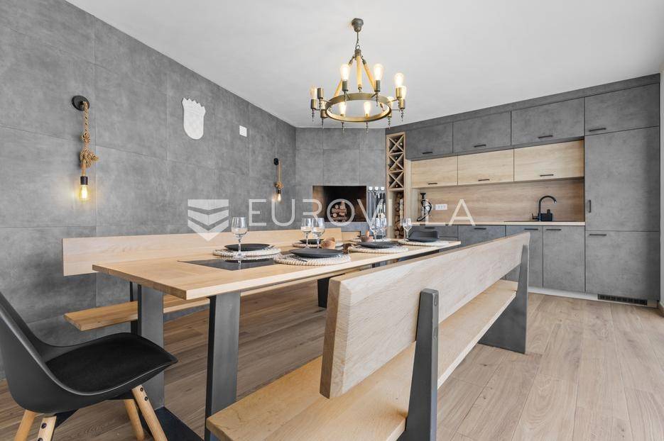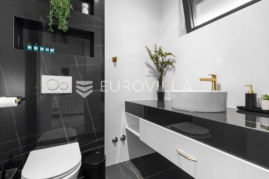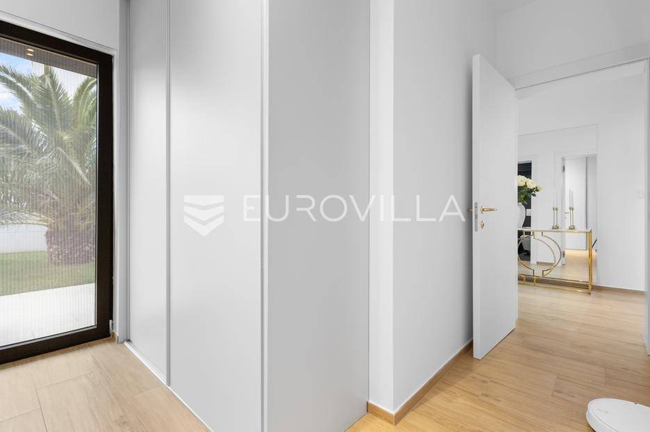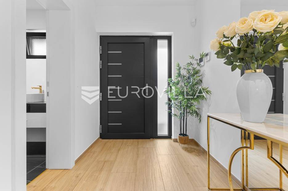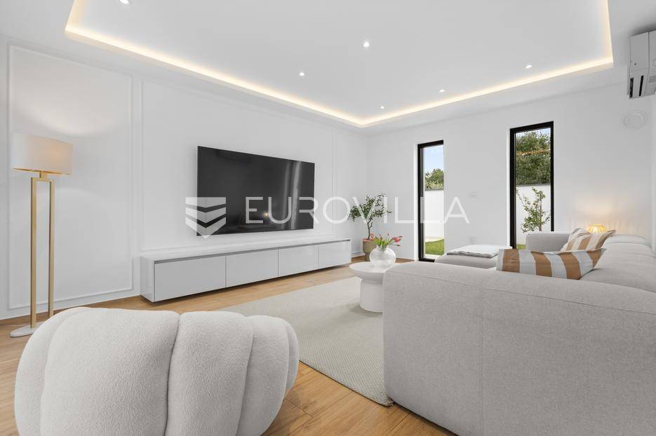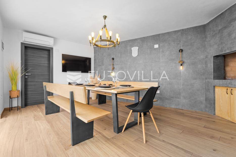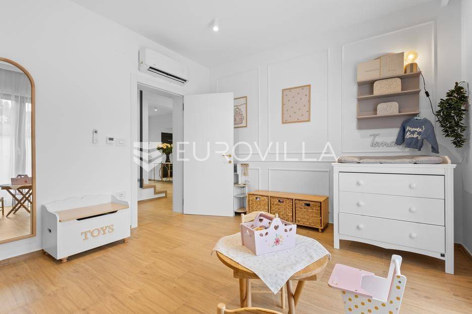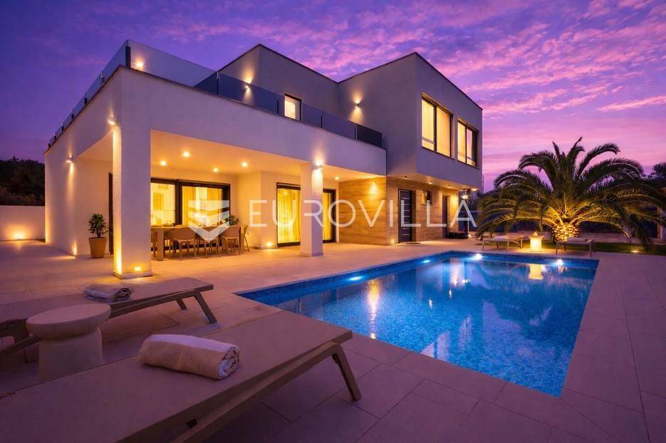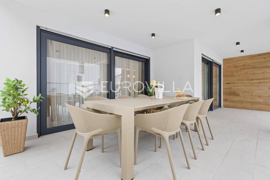 Ova iznimna moderna vila smještena je na mirnoj lokaciji naselja Veli Vrh u Puli, okružena prirodnim zelenilom koje pruža savršen zaklon od gradske užurbanosti. Izgrađena 2021. godine kao vrhunska novogradnja, nekretnina se prostire na zemljištu od 733 m2, dok njezina ukupna stambena površina iznosi 273,79 m2. Vila je pažljivo projektirana kako bi zadovoljila najviše standarde suvremenog stanovanja, kombinirajući funkcionalnost, luksuz i estetsku privlačnost u svakom kutku interijera i eksterijera.Prizemlje vile osmišljeno je kao središte dnevnog života, s impresivnim "open space" konceptom koji obuhvaća dnevni boravak, kuhinju i blagovaonicu na 48 m2. Velike staklene stijene omogućuju izlaz na natkrivenu terasu od 23 m2. U prizemlju se još nalaze elegantan ulazni hodnik, kupaonica, praonica rublja te dodatna soba koja trenutno služi kao dječja igraonica. Unutarnje stubište vodi na prvi kat gdje se nalazi glavna spavaća soba s "walk-in" garderobom, dvije dječje sobe, kupaonica te teretana i sauna od 30 m2. Poseban naglasak stavljen je na dvije prostrane krovne terase koje pružaju privatnost i dodatni prostor za opuštanje.Vanjski dio nekretnine pravi je privatni raj. Centralno mjesto zauzima grijani bazen od 32 m2 s elektrolizom soli, okružen uređenim sunčalištem. Uz bazen se nalazi šarmantna konoba od 25 m2 s kaminom, savršena za druženja. Za sigurnost i praktičnost brinu se garaža od 35 m2, dodatna tri parkirna mjesta, video nadzor te alarmni sustav.Tehnička opremljenost je besprijekorna, s podnim grijanjem na dizalicu topline i klima uređajima u svim prostorijama. Vrhunska izolacija s 9 cm mineralne vune osigurava energetsku učinkovitost, dok interijer krasi namještaj po mjeri te prvoklasna keramika. Ova nekretnina nudi savršen balans između modernog dizajna i mirnog mediteranskog okruženja.Ukoliko Vas zanima razgled ove izuzetne nekretnine, slobodno nam se obratite, stojimo Vam na raspolaganju.... Više na eurovilla.hr, ID: 375690