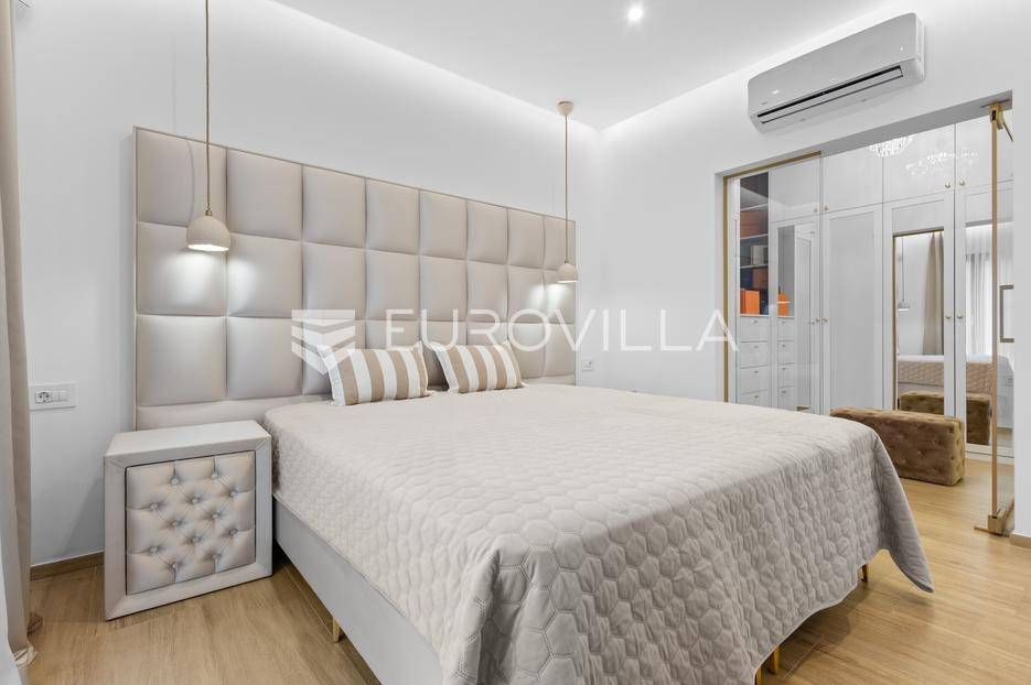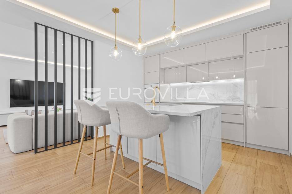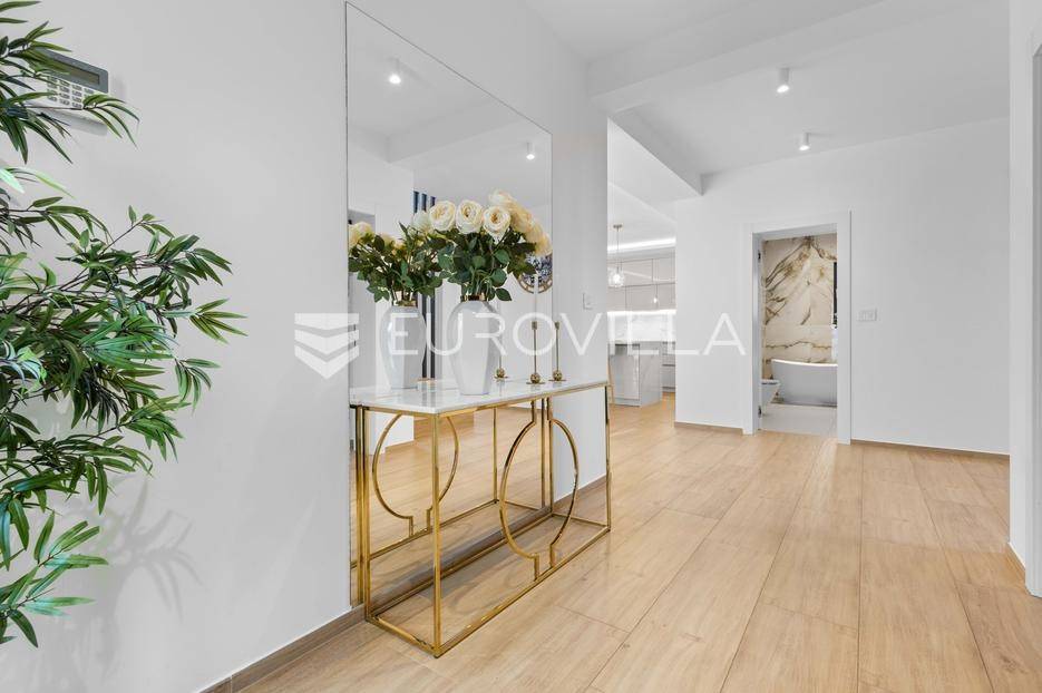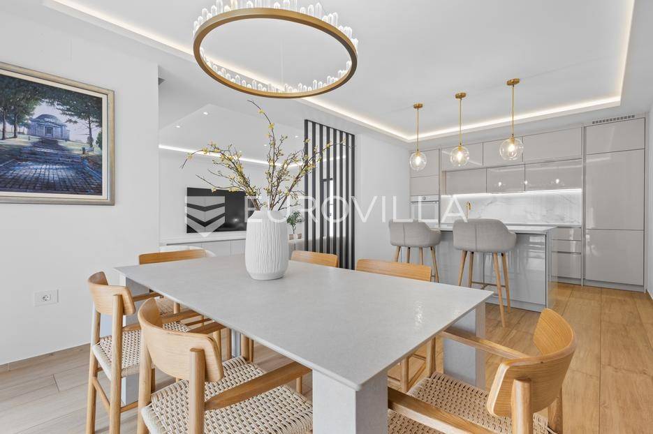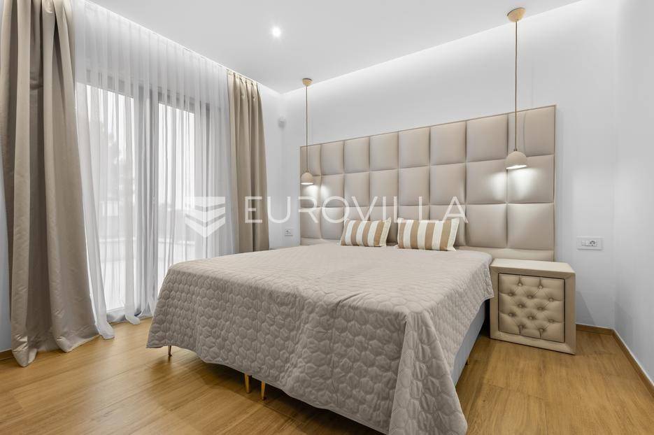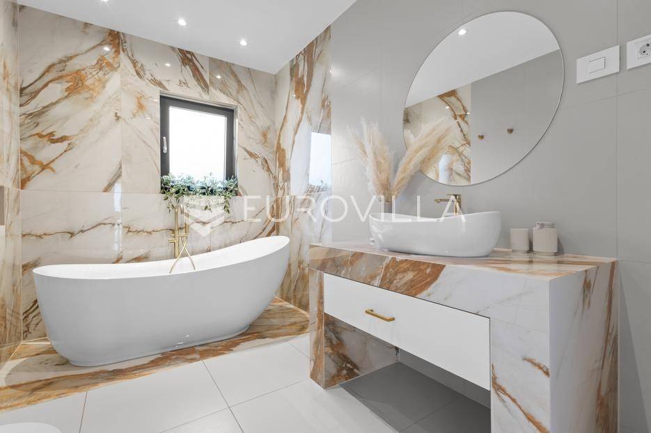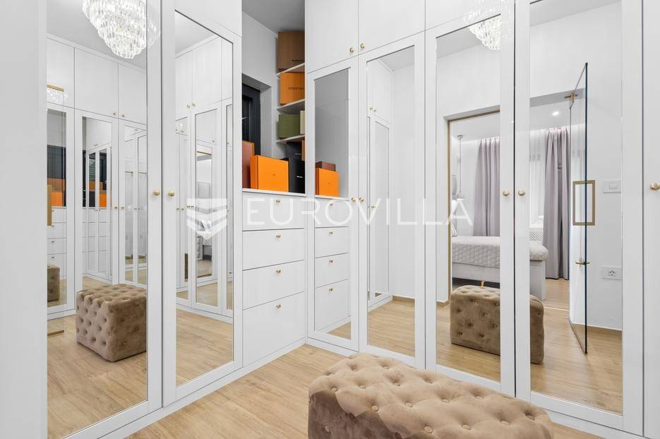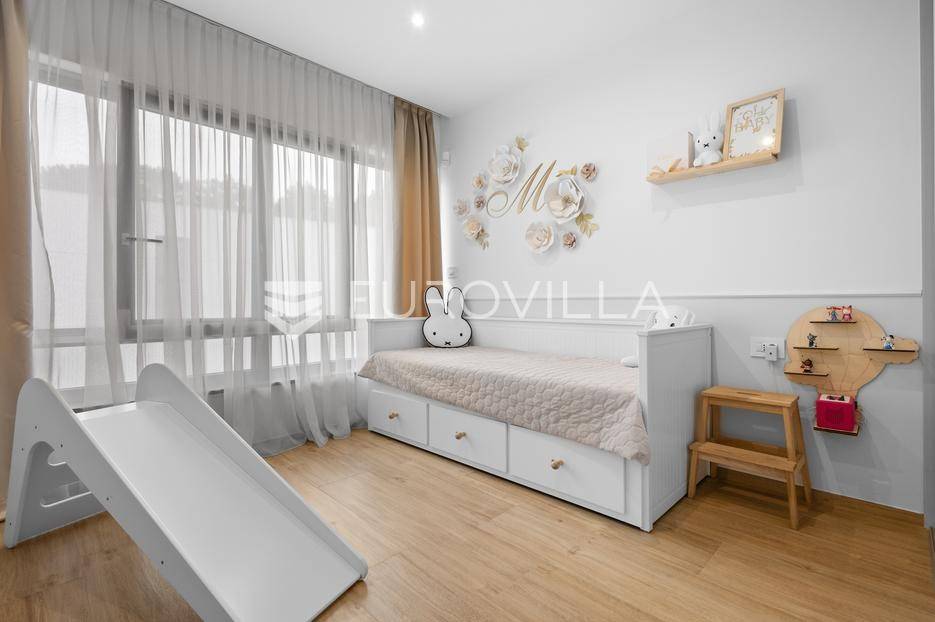 Ova iznimna moderna vila smještena je na mirnoj lokaciji naselja Veli Vrh u Puli, okružena prirodnim zelenilom koje pruža savršen zaklon od gradske užurbanosti. Izgrađena 2021. godine kao vrhunska novogradnja, nekretnina se prostire na zemljištu od 733 m2, dok njezina ukupna stambena površina iznosi 273,79 m2. Vila je pažljivo projektirana kako bi zadovoljila najviše standarde suvremenog stanovanja, kombinirajući funkcionalnost, luksuz i estetsku privlačnost u svakom kutku interijera i eksterijera.Prizemlje vile osmišljeno je kao središte dnevnog života, s impresivnim "open space" konceptom koji obuhvaća dnevni boravak, kuhinju i blagovaonicu na 48 m2. Velike staklene stijene omogućuju izlaz na natkrivenu terasu od 23 m2. U prizemlju se još nalaze elegantan ulazni hodnik, kupaonica, praonica rublja te dodatna soba koja trenutno služi kao dječja igraonica. Unutarnje stubište vodi na prvi kat gdje se nalazi glavna spavaća soba s "walk-in" garderobom, dvije dječje sobe, kupaonica te teretana i sauna od 30 m2. Poseban naglasak stavljen je na dvije prostrane krovne terase koje pružaju privatnost i dodatni prostor za opuštanje.Vanjski dio nekretnine pravi je privatni raj. Centralno mjesto zauzima grijani bazen od 32 m2 s elektrolizom soli, okružen uređenim sunčalištem. Uz bazen se nalazi šarmantna konoba od 25 m2 s kaminom, savršena za druženja. Za sigurnost i praktičnost brinu se garaža od 35 m2, dodatna tri parkirna mjesta, video nadzor te alarmni sustav.Tehnička opremljenost je besprijekorna, s podnim grijanjem na dizalicu topline i klima uređajima u svim prostorijama. Vrhunska izolacija s 9 cm mineralne vune osigurava energetsku učinkovitost, dok interijer krasi namještaj po mjeri te prvoklasna keramika. Ova nekretnina nudi savršen balans između modernog dizajna i mirnog mediteranskog okruženja.Ukoliko Vas zanima razgled ove izuzetne nekretnine, slobodno nam se obratite, stojimo Vam na raspolaganju.... Više na eurovilla.hr, ID: 375690