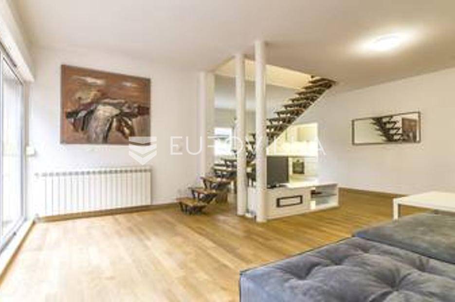 Gajnice, prekrasan dvoetažan četverosoban stan smješten u visokom prizemlju i prvom katu zgrade novije gradnje s garažom i parkirnim mjestom, ukupno 140 m2.Prva etaža sastoji se od: hodnika, gostinjskog toaleta, dnevnog boravka, kuhinje, blagovaonice te dvije terase.Druga etaža sastoji se od: tri spavaće sobe, od kojih jedna ima vlastiti walk-in ormar, druga ima prostranu terasu, manja dječja soba te kupaonica.Izuzetno atraktivan i svijetao s odličnim rasporedom prostorija.Pripadaju mu dvije nenatkrivene terase na prvoj etaži, jedna natkrivena terase na drugoj etaži te garaža površine 22,08m2 i parkirno mjesto površine 12,24 m2. Terase su površine 8,68 m2, 25,04 m2 i 15,9 m2. Sveukupno 140 m2.Stan se prodaje namješten s vrhunskim talijanskim namještajem.Orijentacija sjever-istok-jug.Odlična lokacija okružena mirom i zelenilom. Blizina tržnice, javnog prijevoza te svih bitnijih sadržaja.Za sva dodatna pitanja stojimo na raspolaganju.... Više na eurovilla.hr, ID: 389513