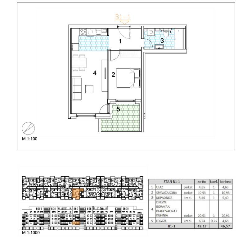 Dvosoban stan površine 46,57 m2 smješten na 1. katu.Stan B1-1 sastoji se od ulaza, spavaće sobe, kupaonice, kuhinje s blagovaonicom, dnevnog boravka te loggije.Velika Gorica, projekt stambene novogradnje namijenjen stalnom stanovanju, koji obuhvaća 91 stambenu jedinicu. U sklopu zgrade osigurano je ukupno 182 garažnih i parkirnih mjesta, od čega je 28 garažnih mjesta smješteno u prizemlju, 97 garažnih i parkirnih mjesta u podzemnoj etaži te dodatnih 57 parkirnih mjesta na razini terena.Uz kupnju stana obavezna je kupnja garažnog mjesta na -1 etaži po cijeni od 25.000,00 EUR ili garažnog mjesta na 0 etaži po cijeni od 30.000,00 EUR zajedno s parkirnim garažnim mjestom po cijeni od 18.000,00 EUR ili vanjskim parkirnim mjestom po cijeni od 10.000,00 EUR. Dakle, garažno mjesto na -1 etaži ili garažno mjesto na 0 etaži + garažno parkirno mjesto ili vanjsko parkirno mjesto.Građevina je projektirana kao armiranobetonska konstrukcija, međusobno povezana zidovima i gredama, s punim armiranobetonskim stropnim pločama i ravnim krovom. Vertikalni konstruktivni sustav čine armiranobetonski zidovi debljine 20 cm izvedeni kroz sve etaže, dok horizontalni sustav čine armiranobetonske ploče debljine 20 cm.Pročelje je predviđeno s toplinskom izolacijom debljine 15 cm u ETICS sustavu, izvedenom od EPS-a, a u zonama požarnih prekida, u kontaktu sa stubištem i na podgledu prizemlja od mineralne vune iste debljine. Završna obrada izvodi se armiranom mrežicom, gletanjem i završnim slojem u boji i teksturi prema projektu. Vanjska stolarija predviđena je kao PVC, u tonu definiranom projektom.Krov je projektiran kao ravni neprohodni krov, a svi slojevi izvedeni su u skladu s projektom fizike zgrade. Unutarnji pregradni zidovi izvode se kao gipskartonski, debljine 10 do 20 cm, ovisno o namjeni prostora, uz primjenu potrebne zvučne izolacije gdje je to predviđeno. Zidne površine su završno obrađene soboslikarskim radovima u boji prema projektu.Podovi u stanovima izvode se kao plivajući sustav s toplinskom izolacijom od polistirena i cementnim estrihom. Završne podne obloge predviđene su prema namjeni prostora: keramika u sanitarijama, kuhinjama i na vanjskim površinama, a troslojni hrastov parket u dnevnim boravcima, blagovaonicama, ulaznim prostorima i spavaćim sobama. U ponudi su tri varijante keramičkih pločica.Grijanje je riješeno plinskim etažnim podnim sustavom. Stanovi su opremljeni klima uređajima marke Bosch, PVC stolarijom s električnim roletama, troslojnim hrastovim parketom te sobnim vratima proizvođača RV Križevci. Ulazna vrata u stanove su protuprovalna, proizvođača Kolnoa sa sustavom zaključavanja Multilock.Useljenje 05/27Za sva pitanja Vam stojimo na raspolaganju.... Više na eurovilla.hr, ID: 436879