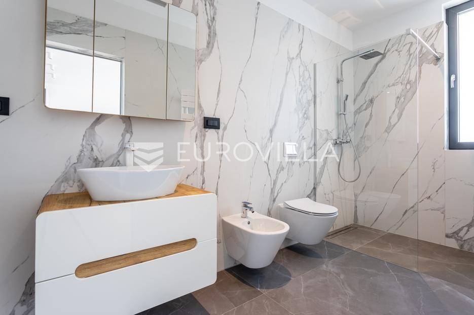 Luksuzan, suvremen kompleks sačinjen od osam moderno dizajniranih vila poželjnijih karakteristika. Okružene čistim Jadranskim morem i zelenilom otoka Čiovo, prava su investicija za svakog ljubitelja privatnosti i mira nedaleko od urbanog života.VILA 5Moderna dvoetažna vila stambene površine 315 m2, smještena nedaleko od mora, na parceli od 697 m2. Sastoji se od velikog dnevnog boravka, potpuno opremljene kuhinje, 4 spavaće sobe, 6 opremljenih kupaonica i garaže dostatne za dva automobila. Prostrana terasa na prizemnoj razini oplemenjena je osvijetljenim grijanim bazenom. Svi objekti u kompleksu imaju pristup moru, kao i mogućnost veza za brodove i manje jahte.Nadalje, sve vile uključuju grijani bazen, garažu i potpuno su klimatizirane.Prodaju se po sistemu "ključ u ruke", s potpuno opremljenim kuhinjama i kupaonicama, a tijekom gradnje korišteni su isključivo visokokvalitetni materijali i oprema; podovi su obloženi modernim keramičkim pločicama velikog formata, parketima, sanitarije vrhunske kvalitete, kao i troslojna stakla renomiranih proizvođača, elektične rolete i sl.Za sva ostala pitanja, stojim na raspolaganju.... Više na eurovilla.hr, ID: 494569