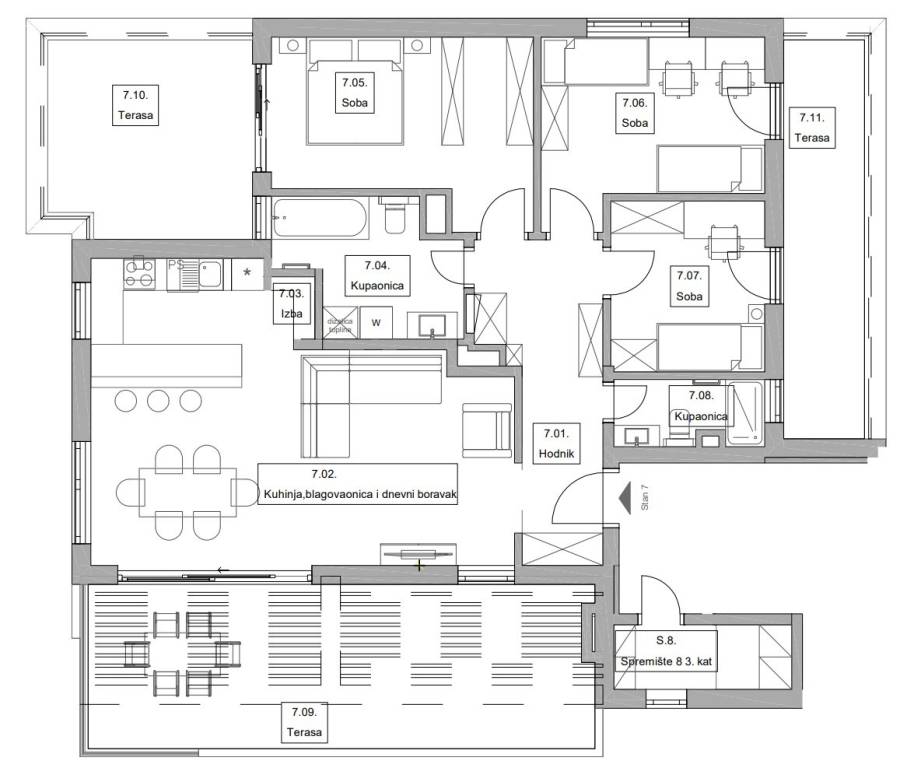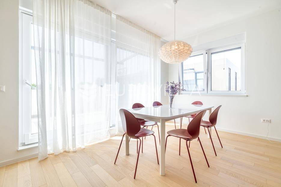 Ulica Pere Budmanija, prekrasan četverosoban penthouse u modernoj i kvalitetnoj novogradnji iz 2024. godine s liftom.Zatvorene površine 96 m2 - s tri terase od 28 m2, 14 m2 i 12 m2, duplom garažom i spremištem. Ukupno neto korisne površine 128 m2.Sastoji se od ulaznog dijela, open space kuhinje s blagovaonom i dnevnim boravkom s izlazom na veliku terasu, odvojennog spavaćeg dijela s tri spavaće sobe i dvije kupaonice, svaka soba s izlazom na terasu.Opremljen podnim grijanjem s dizalicom topline Daikin, Daikin sustav hlađenja, električne rolete...Nalazi se na izvrsnoj lokaciji, u neposrednoj blizini Green gold centra i bussines zone Radnička, javnog prijevoza te svih potrebnih sadržaja za kvalitetan život.Ostale informacije na upit.... Više na eurovilla.hr, ID: 550034