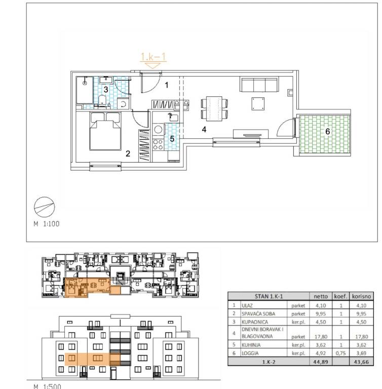 Dvosoban stan površine 43,66 m2 smješten na 1. katu.Stan 1K-1 sastoji se od ulaza, 1 spavaće sobe, kupaonice, dnevnog boravka, kuhinje s blagovaonicom te loggije.Projekt moderne stambene gradnje koji obuhvaća 22 stambene jedinice raspoređene u funkcionalno organiziranoj građevini, uz 36 garažnih mjesta u podzemnoj etaži i dodatnih 8 vanjskih parkirnih mjesta na razini terena. Kolni i pješački pristup omogućen je izravno s javne prometne površine na južnoj strani parcele, a promet u mirovanju riješen je u skladu s važećim urbanističkim planom, čime je osigurana jednostavna dostupnost i kvalitetna organizacija prostora.Uz kupnju stana obavezna je kupnja garažnog parkirnog mjesta te vanjskog parkirnog mjesta.Građevina je projektirana kao armiranobetonska konstrukcija, s nosivim zidovima i gredama međusobno povezanim u cjelovit sustav te punim armiranobetonskim stropnim i ravnim krovnim pločama. Vertikalne elemente čine armiranobetonski zidovi debljine 20 cm kroz sve etaže, dok horizontalni sustav čine armiranobetonske ploče iste debljine. Takav konstruktivni koncept osigurava stabilnost, trajnost i sigurnost objekta.Pročelje će biti izvedeno u ETICS sustavu s toplinskom izolacijom od EPS-a i mineralne vune debljine 15 cm, ovisno o poziciji i zahtjevima zaštite od požara, uz završnu obradu u boji i teksturi prema projektu. Vanjska stolarija predviđena je kao PVC, uz električno upravljane rolete, čime se dodatno doprinosi energetskoj učinkovitosti i komforu stanovanja. Ravni krov projektiran je kao neprohodan, s tehničkim slojevima definiranim elaboratom fizike zgrade.Unutarnji prostori osmišljeni su s naglaskom na funkcionalnost i dugotrajnost materijala. Sustav grijanja izveden je kao plinsko etažno podno grijanje, koje omogućuje ravnomjernu raspodjelu topline i optimalnu iskoristivost prostora bez radijatora. Za hlađenje su predviđeni klima uređaji proizvođača Bosch.Podovi se izvode kao plivajući sustav s toplinskom i zvučnom izolacijom te cementnim estrihom. U dnevnim boravcima, blagovaonicama, hodnicima i spavaćim sobama predviđen je troslojni hrastov parket, dok su u sanitarnim prostorima, kuhinjama i na vanjskim površinama planirane keramičke pločice. Kupcima će biti ponuđene tri varijante keramike u vrijednosti do 35 EUR/m², a sav dodatni odabir i eventualne izmjene moguće su putem tvrtke F.I.C. d.o.o., koja osigurava salonski odabir materijala i ugradnju.Unutarnja sobna vrata predviđena su od proizvođača RV Križevci, dok su ulazna vrata u stanove protuprovalna vrata proizvođača Kolnoa, opremljena sustavom zaključavanja Mul-T-Lock, čime je osigurana viša razina sigurnosti.Ovaj projekt u Velikoj Gorici predstavlja priliku za kupnju stana u novogradnji koja objedinjuje provjerenu konstrukcijsku kvalitetu, suvremene sustave grijanja i hlađenja te mogućnost prilagodbe završnih materijala prema željama kupca, u urbanoj zoni s dobrom prometnom povezanošću i razvijenom infrastrukturom.Useljenje: 05/2027... Više na eurovilla.hr, ID: 768656