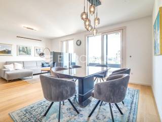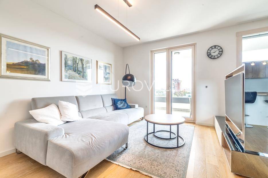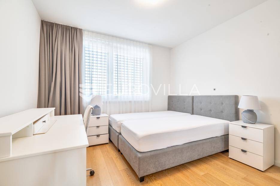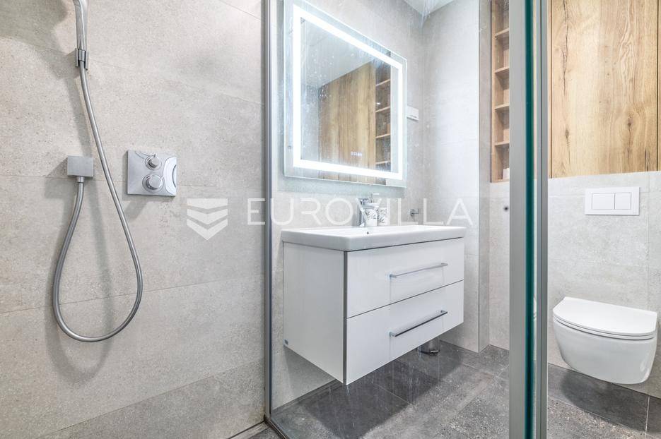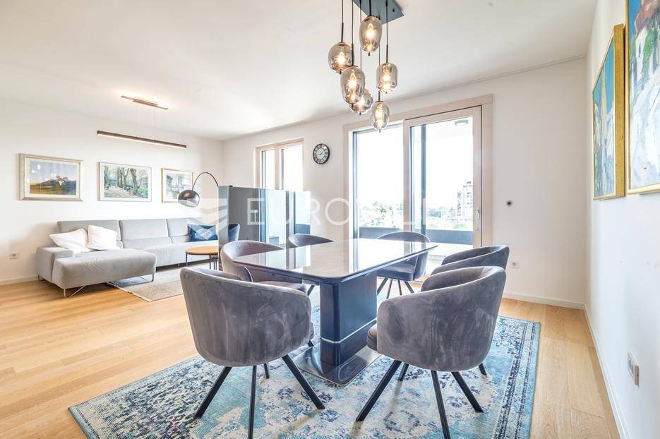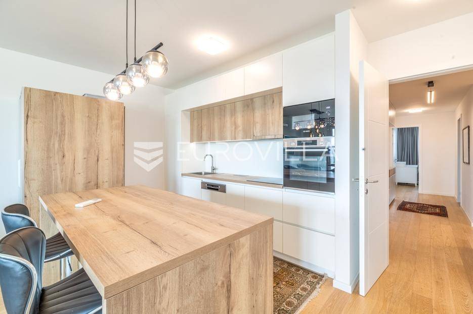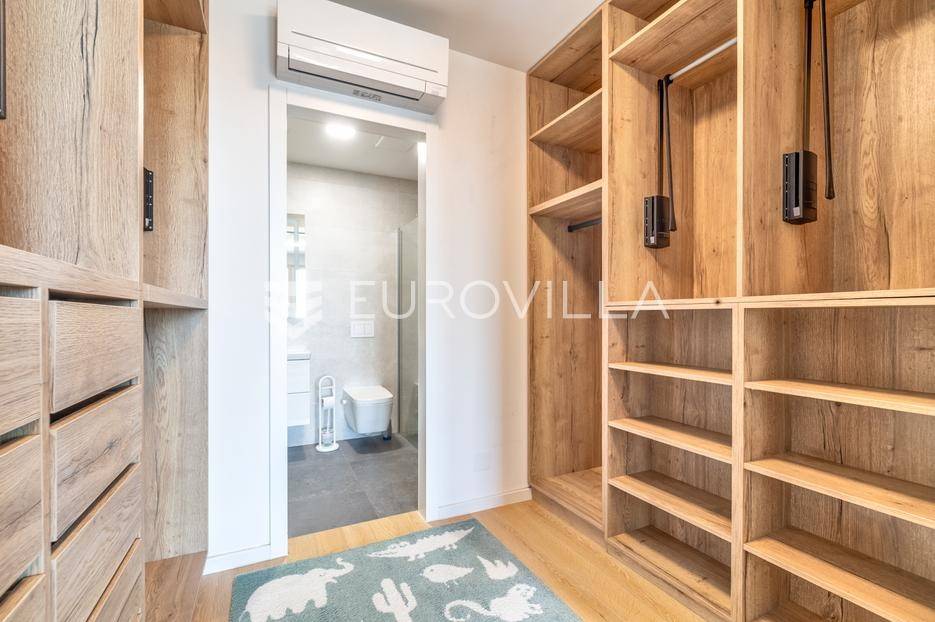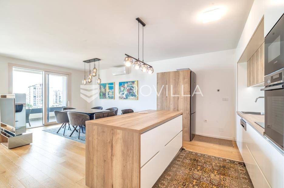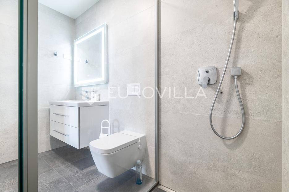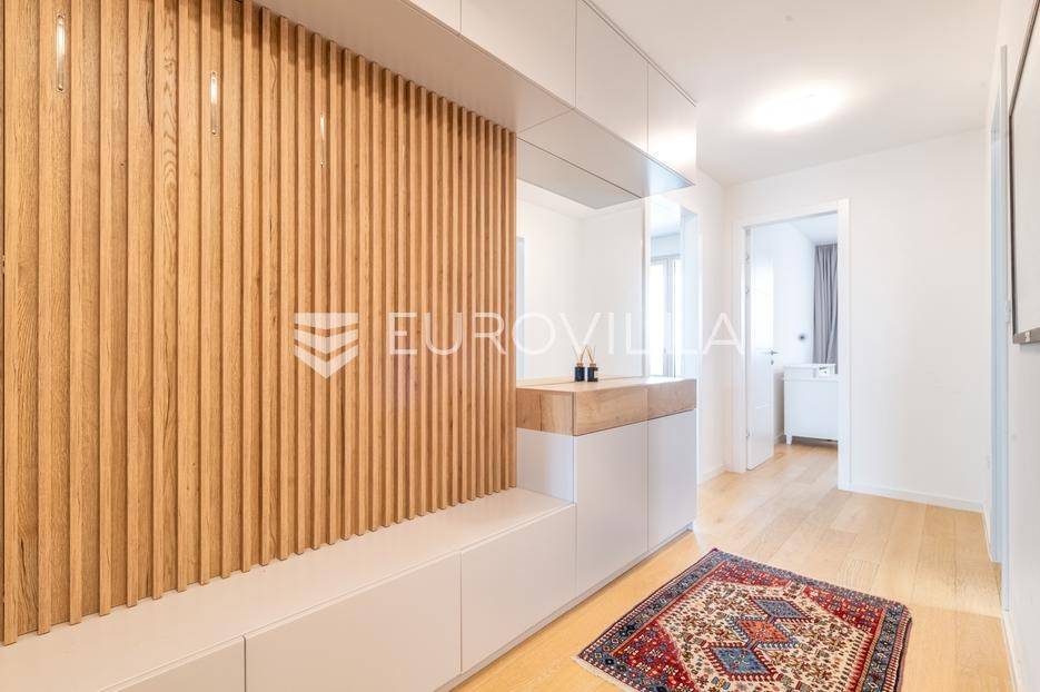Atraktivan trosobna stan ukupne neto korisne površine 122,57 m², smješten na osmom katu moderne novogradnje. Zatvorena površina stana iznosi 99,50 m², a dodatno mu pripadaju dvije prostrane lođe ukupne neto površine 14,90 m² te garažno parkirno mjesto neto površine 8,17 m². Stan se prodaje s cjelokupnim namještajem, koji je izrađen po mjeri i uključen je u cijenu.Prostor je funkcionalno raspoređen te obuhvaća ulazni prostor, hodnik, dnevni boravak s blagovaonicom i kuhinjom, dvije spavaće sobe, dvije kupaonice - jednu s tušem i drugu s kadom - zaseban toalet i gospodarski prostor.Stan je opremljen visokokvalitetnim materijalima i suvremenim sustavima koji osiguravaju udobnost i dugotrajnost. U svim prostorijama nalazi se podno grijanje s individualnim termostatima, kao i klima uređaji Mitsubishi s vanjskom jedinicom smještenom na krovu zgrade. Ugrađen je omekšivač vode, sanitarije su marke Villeroy & Boch, dok su slavine i tuševi Hansgrohe, uz Hüppe tuš kabine i WC s funkcijom bidea. Vanjska stolarija je drvo-aluminij s Medle žaluzinama i komarnicima na svim otvorima, a podove prekriva Mopar parket od hrasta debljine 12 mm.Zgrada je dovršena 2022. godine, a odlikuje se visokom kvalitetom gradnje i izvrsnom zvučnom izolacijom zahvaljujući vertikalnoj kanalizaciji od 7 i posebnoj foliji u glazuri koja sprječava prijenos vertikalne buke. Stan je opremljen internetskim i TV priključcima u svakoj sobi, kolor interfon sustavom, te ima poseban elektro sat i utičnicu za punjenje električnog automobila. U zgradi se nalazi brzi i povišeni Kone lift.Nalazi se na mirnoj i izuzetno traženoj lokaciji, u neposrednoj blizini svih važnih sadržaja - trgovina, škola, vrtića, javnog prijevoza i zelenih površina.Za sva pitanja Vam stojimo na raspolaganju.... Više na eurovilla.hr, ID: 812998