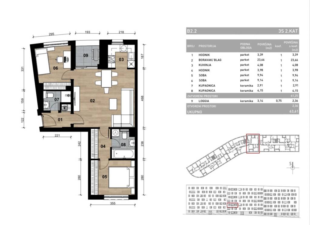 Zagreb, Dubrava, dvosoban stan, u novogradnji u izgradnji,Objekt je projektiran prema najsuvremenijim standardima gradnje; dok je čitava konstrukcija armirano - betonska.Stan oznake B2.2 na drugom katu, površine 63,61 m2.Sastoji se od: ulaznog hodnika, dnevnog boravka i blagovaonice s izlazom na loggiu ( površine 3,14 m2), kuhinje, spavaće sobe i toaleta, drugog hodnika hodnika te spavaće sobe i kupaonice .Spavaća soba i dnevni boravak opremljeni su klima uređajima uz mogućnost upravljanja putem aplikacije.Grijanje i priprema tople vode preko plinskih kondenzacijskih bojlera. Ugrađen je sustav za daljinsko očitanje i digitalni termostat uz mogućnost spajanja na Wi-fi te upravljanje putem aplikacije. U svim prostorijama su moderni pločasti radijatoriOprema stana sadrži : protupožarna i protuprovalna ulazna vrata s zvučnom izolacijom, troslojna stakla, aluminijske rolete, hrastov parket te keramičke pločice prve klase.Vrhunska izgradnja s visoko kvalitetnim materijalima renomiranih proizvođača.Uz stan je obvezna kupnja vanjskog parkirnog mjesta ili garažnog parkirnog mjesta. Spremište opcionalno.Odlična lokacija. Blizina dječjeg vrtića, osnovne škole, bolnice, doma zdravlja, shopping centra, crkve, ljekarne i dermatološke klinike, blizina i parka Maksimir teZET okretište Dubrava, dok je autobusna stanica u neposrednoj blizini zgrade.Planirano useljenje: jesen 2026 godine.Ostale informacije na upit.... Više na eurovilla.hr, ID: 862212