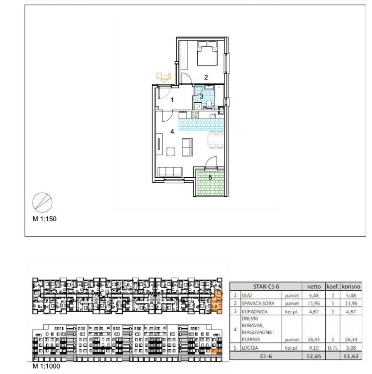 Dvosoban stan površine 51,63 m2 smješten na 1. katu.Stan C1-6 sastoji se od ulaza, spavaće sobe, kupaonice, dnevnog boravka, kuhinje s blagovaonicom te loggije.Velika Gorica, projekt stambene novogradnje namijenjen stalnom stanovanju, koji obuhvaća 91 stambenu jedinicu. U sklopu zgrade osigurano je ukupno 182 garažnih i parkirnih mjesta, od čega je 28 garažnih mjesta smješteno u prizemlju, 97 garažnih i parkirnih mjesta u podzemnoj etaži te dodatnih 57 parkirnih mjesta na razini terena.Uz kupnju stana obavezna je kupnja garažnog mjesta na -1 etaži po cijeni od 25.000,00 EUR ili garažnog mjesta na 0 etaži po cijeni od 30.000,00 EUR zajedno s parkirnim garažnim mjestom po cijeni od 18.000,00 EUR ili vanjskim parkirnim mjestom po cijeni od 10.000,00 EUR. Dakle, garažno mjesto na -1 etaži ili garažno mjesto na 0 etaži + garažno parkirno mjesto ili vanjsko parkirno mjesto.Građevina je projektirana kao armiranobetonska konstrukcija, međusobno povezana zidovima i gredama, s punim armiranobetonskim stropnim pločama i ravnim krovom. Vertikalni konstruktivni sustav čine armiranobetonski zidovi debljine 20 cm izvedeni kroz sve etaže, dok horizontalni sustav čine armiranobetonske ploče debljine 20 cm.Pročelje je predviđeno s toplinskom izolacijom debljine 15 cm u ETICS sustavu, izvedenom od EPS-a, a u zonama požarnih prekida, u kontaktu sa stubištem i na podgledu prizemlja od mineralne vune iste debljine. Završna obrada izvodi se armiranom mrežicom, gletanjem i završnim slojem u boji i teksturi prema projektu. Vanjska stolarija predviđena je kao PVC, u tonu definiranom projektom.Krov je projektiran kao ravni neprohodni krov, a svi slojevi izvedeni su u skladu s projektom fizike zgrade. Unutarnji pregradni zidovi izvode se kao gipskartonski, debljine 10 do 20 cm, ovisno o namjeni prostora, uz primjenu potrebne zvučne izolacije gdje je to predviđeno. Zidne površine su završno obrađene soboslikarskim radovima u boji prema projektu.Podovi u stanovima izvode se kao plivajući sustav s toplinskom izolacijom od polistirena i cementnim estrihom. Završne podne obloge predviđene su prema namjeni prostora: keramika u sanitarijama, kuhinjama i na vanjskim površinama, a troslojni hrastov parket u dnevnim boravcima, blagovaonicama, ulaznim prostorima i spavaćim sobama. U ponudi su tri varijante keramičkih pločica.Grijanje je riješeno plinskim etažnim podnim sustavom. Stanovi su opremljeni klima uređajima marke Bosch, PVC stolarijom s električnim roletama, troslojnim hrastovim parketom te sobnim vratima proizvođača RV Križevci. Ulazna vrata u stanove su protuprovalna, proizvođača Kolnoa sa sustavom zaključavanja Multilock.Useljenje 05/27Za sva pitanja Vam stojimo na raspolaganju.... Više na eurovilla.hr, ID: 898498