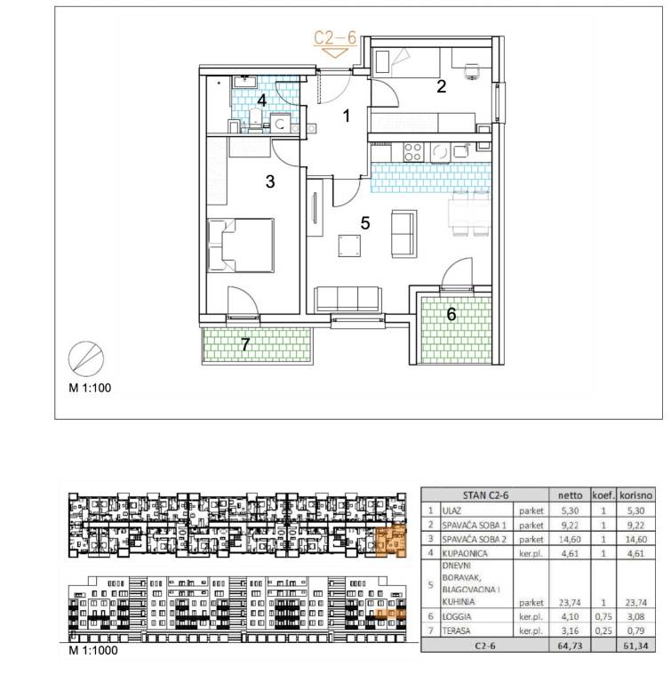 Trosoban stan površine 61,34 m2 smješten na 2. katu.Stan C2-6 sastoji se od ulaza, 2 spavaće sobe, kupaonice, dnevnog boravka, kuhinje s blagovaonicom, terase te loggije.Velika Gorica, projekt stambene novogradnje namijenjen stalnom stanovanju, koji obuhvaća 91 stambenu jedinicu. U sklopu zgrade osigurano je ukupno 182 garažnih i parkirnih mjesta, od čega je 28 garažnih mjesta smješteno u prizemlju, 97 garažnih i parkirnih mjesta u podzemnoj etaži te dodatnih 57 parkirnih mjesta na razini terena.Uz kupnju stana obavezna je kupnja garažnog mjesta na -1 etaži po cijeni od 25.000,00 EUR ili garažnog mjesta na 0 etaži po cijeni od 30.000,00 EUR zajedno s parkirnim garažnim mjestom po cijeni od 18.000,00 EUR ili vanjskim parkirnim mjestom po cijeni od 10.000,00 EUR. Dakle, garažno mjesto na -1 etaži ili garažno mjesto na 0 etaži + garažno parkirno mjesto ili vanjsko parkirno mjesto.Građevina je projektirana kao armiranobetonska konstrukcija, međusobno povezana zidovima i gredama, s punim armiranobetonskim stropnim pločama i ravnim krovom. Vertikalni konstruktivni sustav čine armiranobetonski zidovi debljine 20 cm izvedeni kroz sve etaže, dok horizontalni sustav čine armiranobetonske ploče debljine 20 cm.Pročelje je predviđeno s toplinskom izolacijom debljine 15 cm u ETICS sustavu, izvedenom od EPS-a, a u zonama požarnih prekida, u kontaktu sa stubištem i na podgledu prizemlja od mineralne vune iste debljine. Završna obrada izvodi se armiranom mrežicom, gletanjem i završnim slojem u boji i teksturi prema projektu. Vanjska stolarija predviđena je kao PVC, u tonu definiranom projektom.Krov je projektiran kao ravni neprohodni krov, a svi slojevi izvedeni su u skladu s projektom fizike zgrade. Unutarnji pregradni zidovi izvode se kao gipskartonski, debljine 10 do 20 cm, ovisno o namjeni prostora, uz primjenu potrebne zvučne izolacije gdje je to predviđeno. Zidne površine su završno obrađene soboslikarskim radovima u boji prema projektu.Podovi u stanovima izvode se kao plivajući sustav s toplinskom izolacijom od polistirena i cementnim estrihom. Završne podne obloge predviđene su prema namjeni prostora: keramika u sanitarijama, kuhinjama i na vanjskim površinama, a troslojni hrastov parket u dnevnim boravcima, blagovaonicama, ulaznim prostorima i spavaćim sobama. U ponudi su tri varijante keramičkih pločica.Grijanje je riješeno plinskim etažnim podnim sustavom. Stanovi su opremljeni klima uređajima marke Bosch, PVC stolarijom s električnim roletama, troslojnim hrastovim parketom te sobnim vratima proizvođača RV Križevci. Ulazna vrata u stanove su protuprovalna, proizvođača Kolnoa sa sustavom zaključavanja Multilock.Useljenje 05/27Za sva pitanja Vam stojimo na raspolaganju.... Više na eurovilla.hr, ID: 919434
