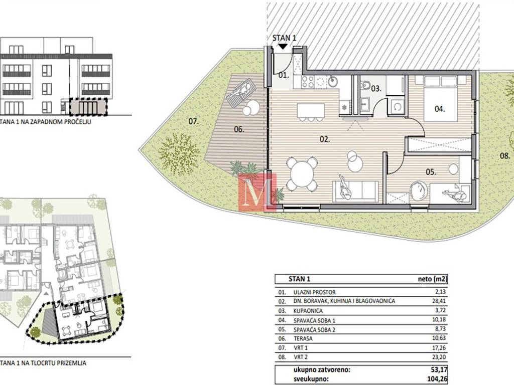 Modern 2-bedroom apartment in a prime location in Donja Dubrava with a terrace, garden and one parking space. The apartment consists of an entrance hall, open space living room with kitchen and dining room, 2 bedrooms, bathroom (shower), terrace, garden and one parking space. The apartment is located in close proximity to all amenities needed for quality everyday life: bus station 250 m Trnava Health Center 300 m Jabuka kindergarten 350 m new elementary school (under construction) 350 m neighborhood shops, cafes and restaurants 200300 m train station (Branimirova) and Borongaj campus nearby City East Shopping Center a few minutes Excellent transport connections and developed infrastructure further increase the value of this location. Apartment 53.17 m2, + 10.63m2 terrace + 40.46m2 garden with parking space included in the price. No agency fee for the buyer.