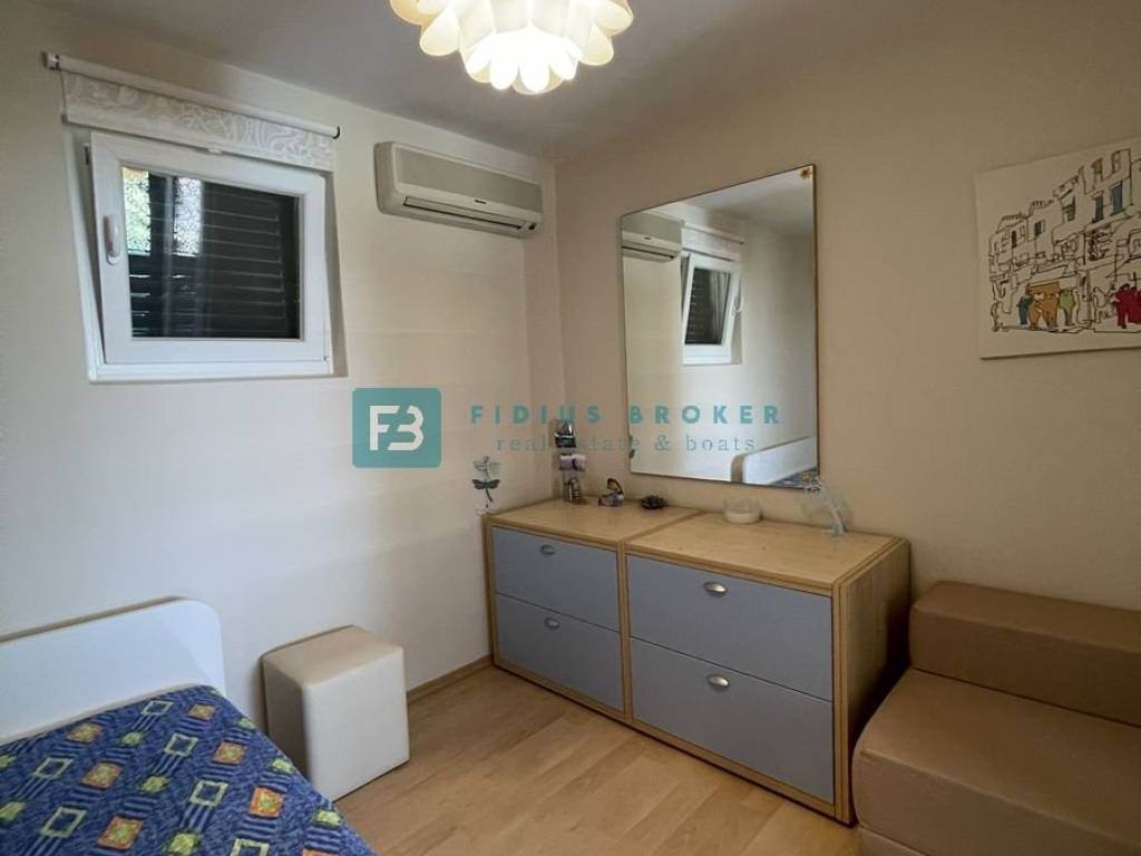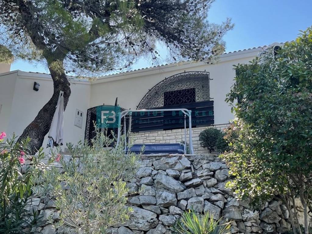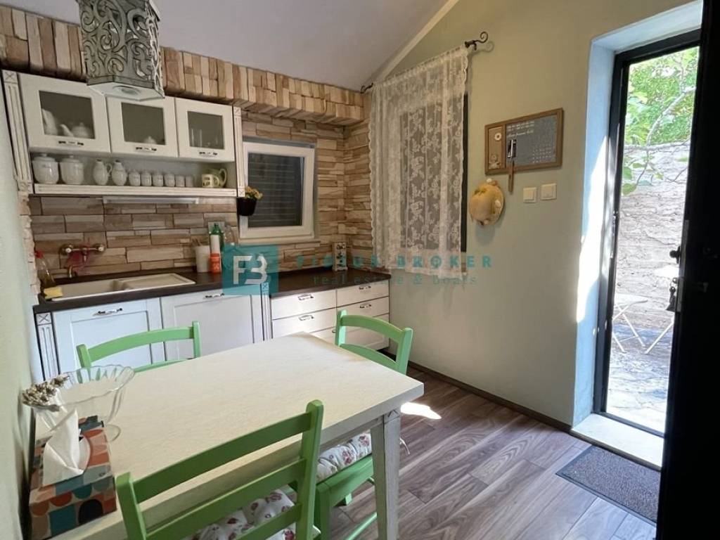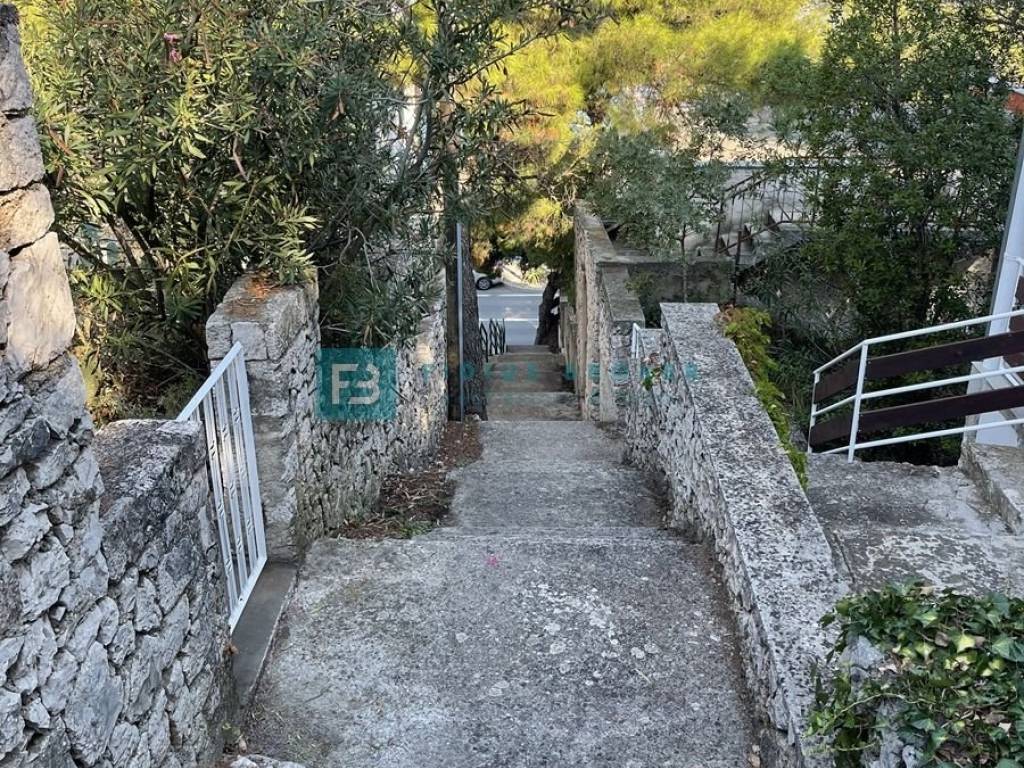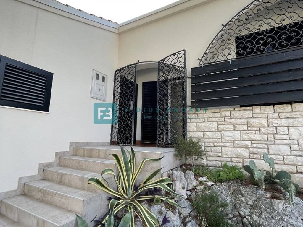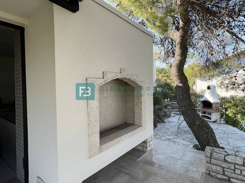 The house consists of a main living area and a separate studio apartment for guests, which makes it ideal for both private enjoyment and tourist rental. The main house has two bedrooms, a bathroom, and a kitchen with a dining room and a living room that opens onto a covered terrace with a beautiful sea view. On the lower level there is a barbecue area, a large terrace perfect for outdoor gatherings, as well as an additional room that serves as a storage room. The studio apartment with a separate entrance is fully equipped and functional, with a kitchen, dining room, bathroom, sleeping area and a private terrace in front of the apartment. Everything is arranged in a terraced manner, with a garden that naturally blends into the environment and further emphasizes the Mediterranean atmosphere.