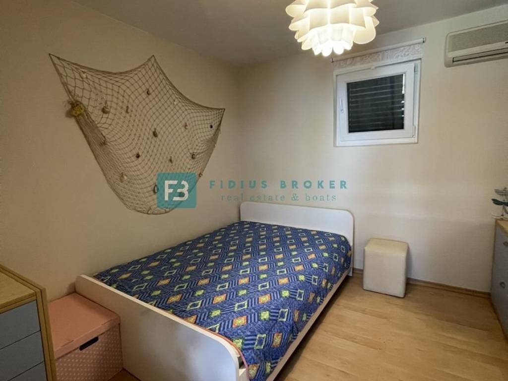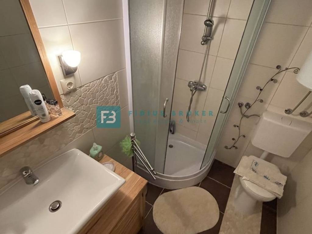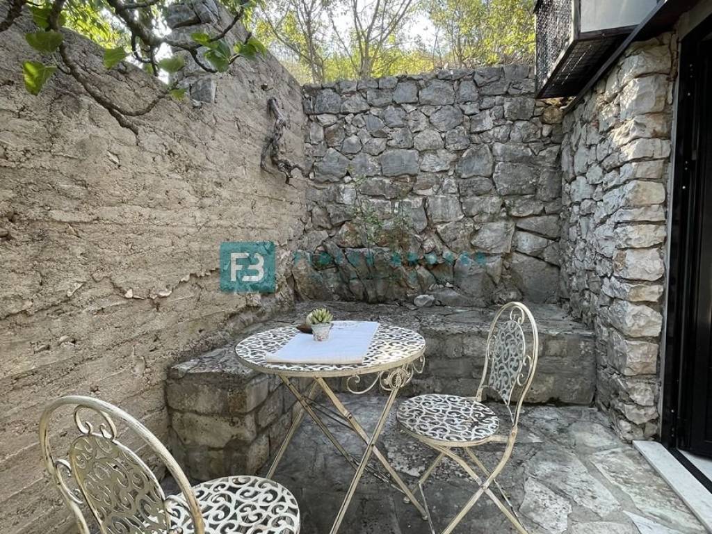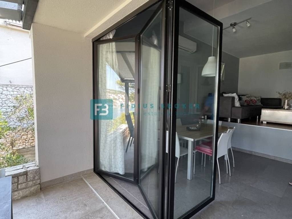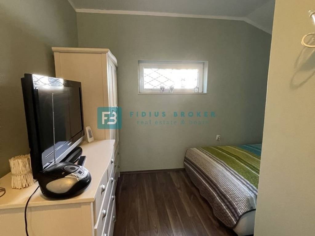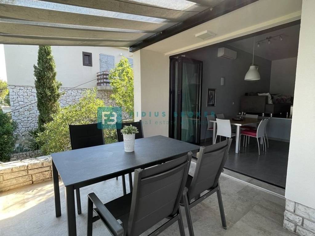 The house consists of a main living area and a separate studio apartment for guests, which makes it ideal for both private enjoyment and tourist rental. The main house has two bedrooms, a bathroom, and a kitchen with a dining room and a living room that opens onto a covered terrace with a beautiful sea view. On the lower level there is a barbecue area, a large terrace perfect for outdoor gatherings, as well as an additional room that serves as a storage room. The studio apartment with a separate entrance is fully equipped and functional, with a kitchen, dining room, bathroom, sleeping area and a private terrace in front of the apartment. Everything is arranged in a terraced manner, with a garden that naturally blends into the environment and further emphasizes the Mediterranean atmosphere.