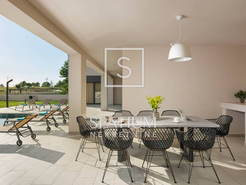 LABIN AREA, we are offering an exclusive villa with a swimming pool and tennis court, located in a მშვიდ and well-maintained neighborhood on the southeastern coast of Istria. This property offers a perfect combination of luxury, functionality, and complete privacy.