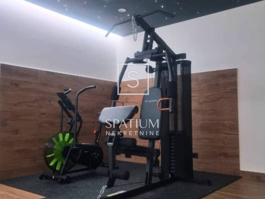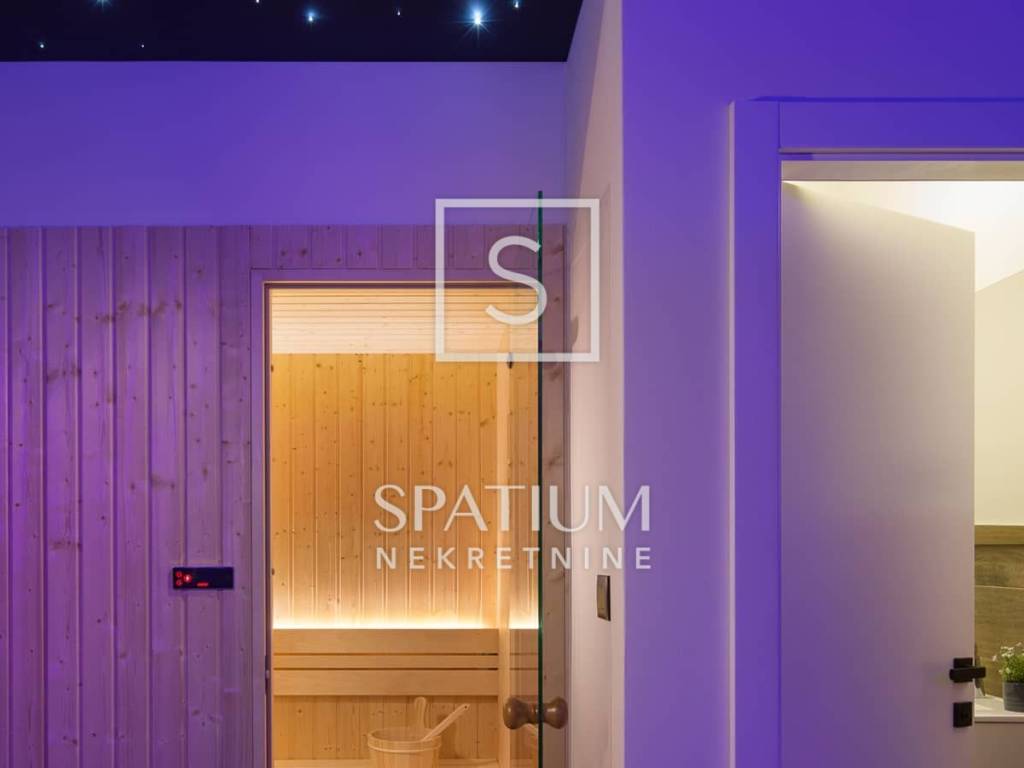 The ground floor features a spacious living room with a fireplace, a dining area, and a modern fully equipped kitchen, all connected to a covered terrace and a summer kitchen with a fireplace. Additional value on the ground floor includes a wellness area with a sauna and gym with a private bathroom, as well as a bedroom with an en suite bathroom, laundry room, guest toilet, technical room, and storage room.