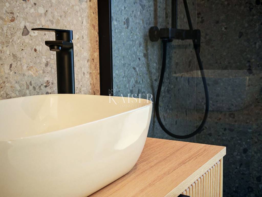 The building and apartments were built with an emphasis on top energy efficiency, durability and living comfort. External PVC joinery with triple-layered glass ensures excellent thermal and sound insulation, while aluminum electric shutters provide additional protection and practicality. The facade is made in the demit system with 12 cm thick insulation on the floors, while the ground floor is further refined with 8 cm insulation and a 2 cm finish of natural Travertino Classico stone, which gives the building an elegant Mediterranean character. Heating and cooling are solved by Mitsubishi air conditioners, while additional comfort during the colder months is provided by electric underfloor heating in all rooms, which is controlled via modern Wi-Fi thermostats. The floor coverings are made of top-quality ceramic tiles from the renowned Italian manufacturer Marca Corona, which give the space an impression of luxury and long-lasting quality.