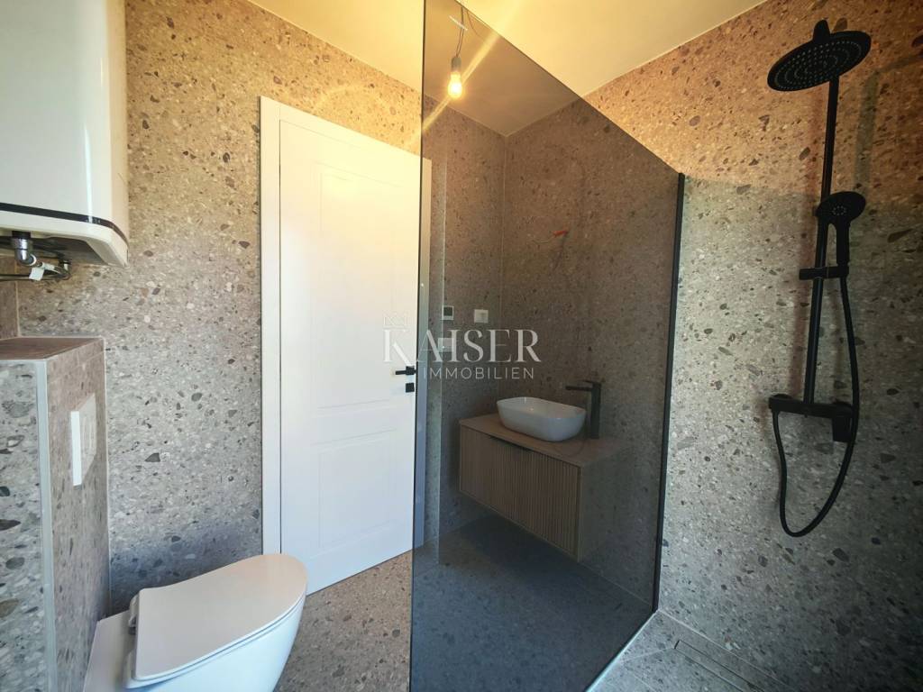 Kaiser Immobilien presents a functional and modernly designed two-bedroom apartment with a total area of 59.22 m² located in a quality new building with a total of eight apartments, which stands out for its modern architecture, high quality construction and quiet location near the sea. The apartment also has its own covered parking space, which further contributes to the practicality and comfort of everyday life.