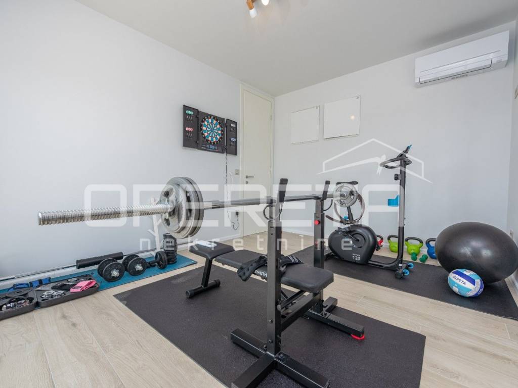 The ground floor consists of a spacious open-plan living room, kitchen, and dining area, along with a fitness room and a bathroom. An internal staircase leads to the first floor, where there are four bedrooms, two bathrooms, a laundry room, and a terrace.
