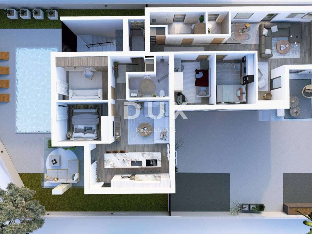 This exclusive penthouse covers the entire second floor of the building and offers supreme comfort and spaciousness. Situated in an attractive location, it is perfect for family life or an investment in a top-class property. The apartment consists of four spacious bedrooms, two elegant bathrooms and two open-space living rooms connected to the kitchen and dining room, providing the perfect balance of privacy and common space. The visualization shows 2 wings, one designed as a parental wing and the other as a children's wing. One room in the parental wing can be decorated as a home office. During the construction of the building, it is possible to separate the space into two separate apartments. All apartments will be decorated with parquet floors and first-class ceramics.