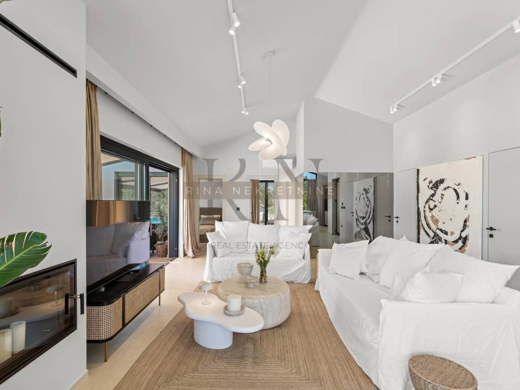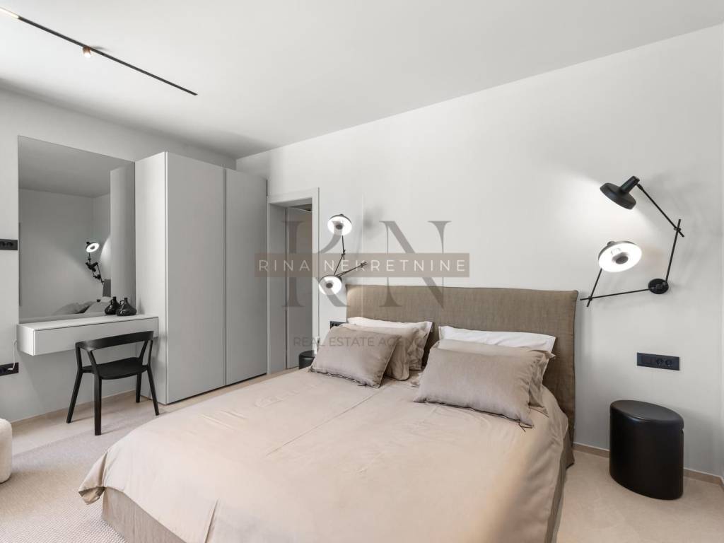 The villa is fully designed with carefully selected pieces of luxurious and collected furniture and equipment: • Caruso sofa with double upholstery and dining chairs • Gervasoni chest of drawers • Copat Life kitchen with Bora Bora hood and top-quality Miele appliances • Smeg small appliances • Copat Life dining table • Flos ambient lighting • Kave Home outdoor furniture • Custom-made wardrobes in all bedrooms • Fireplace in the living room for additional atmosphere and comfort