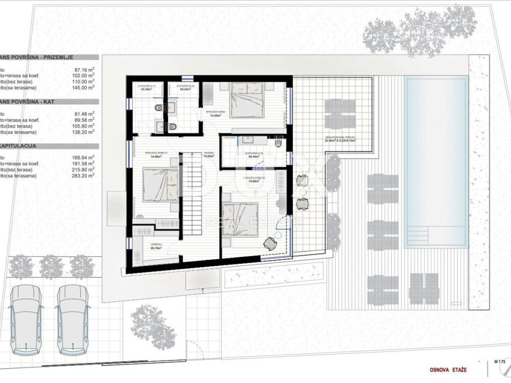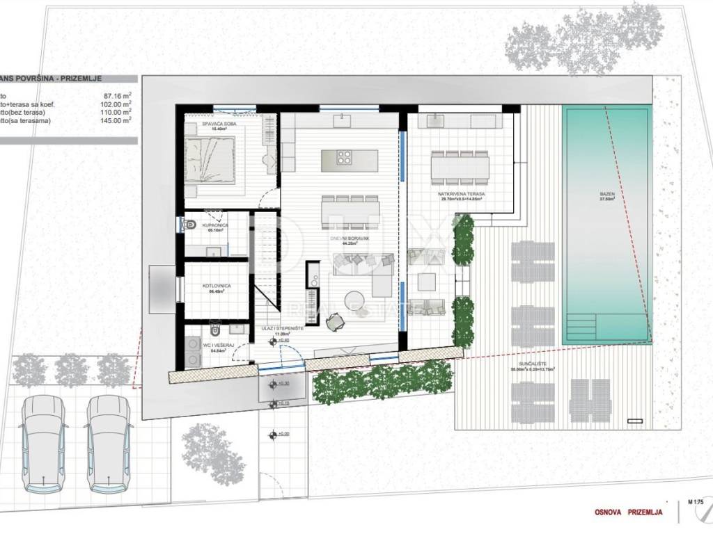 The yard is completely fenced and elegantly decorated with grass and Mediterranean plants, and the central place is occupied by a 37 m swimming pool with a sunbathing area.