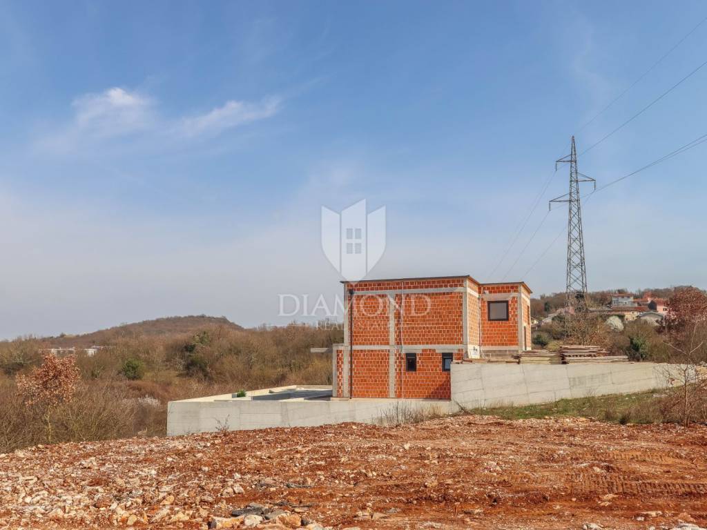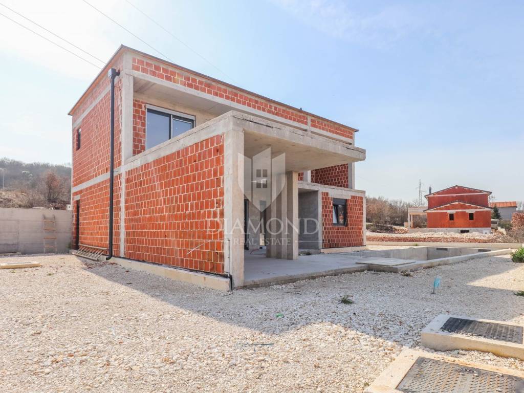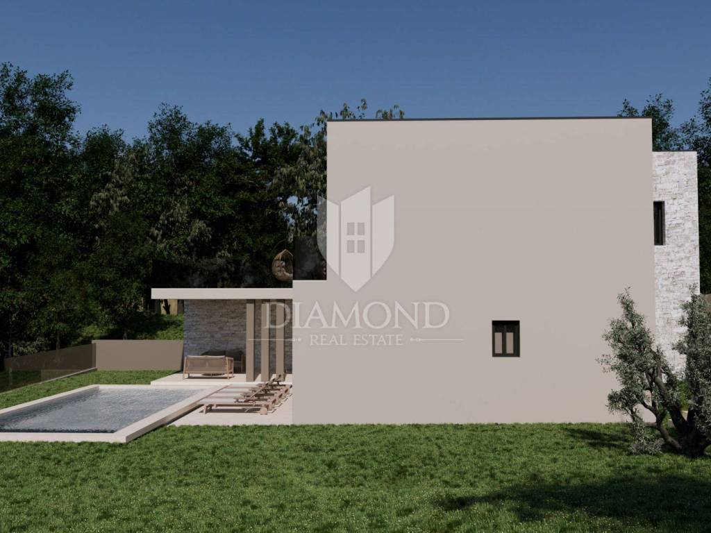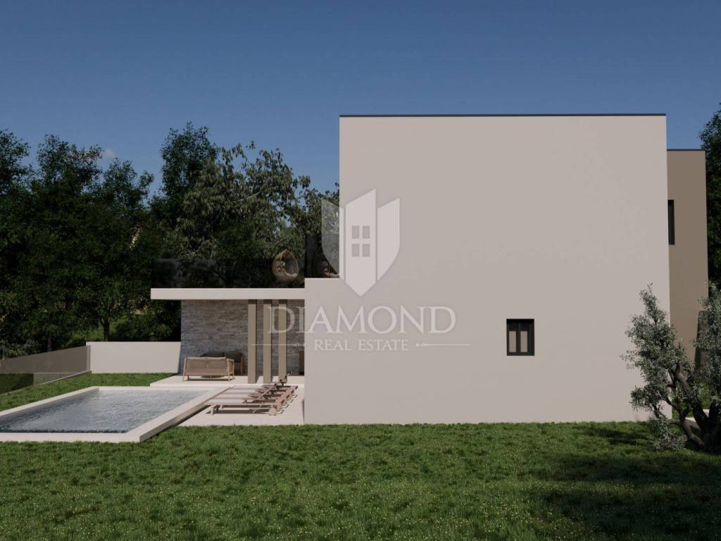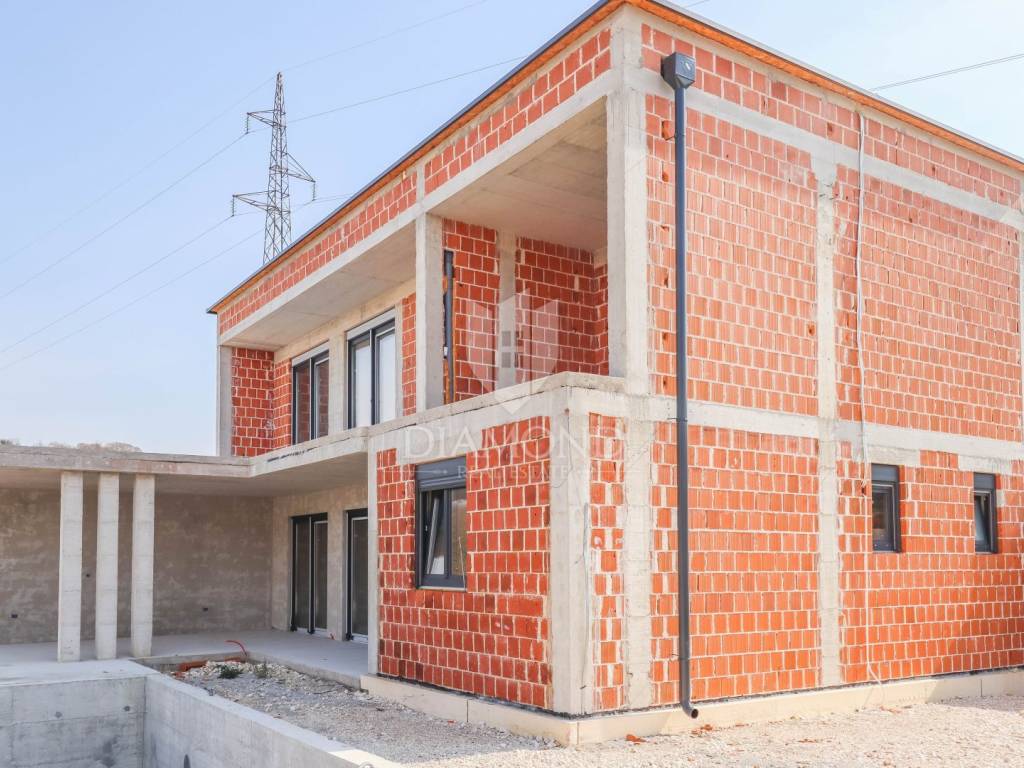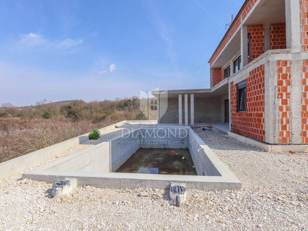A luxury detached house with a swimming pool, currently in the final stage of construction, is for sale. It is located in a quiet and pleasant neighborhood just 10 kilometers from the beautiful town of Rovinj. The property sits on a plot of 643 m² and has a total living area of 179.78 m², along with a swimming pool of 35 m². The house has two floors, and the planned completion of construction is in 2026. The property is being sold unfurnished, giving the future owner the opportunity to design and furnish the interior according to their own wishes and style.