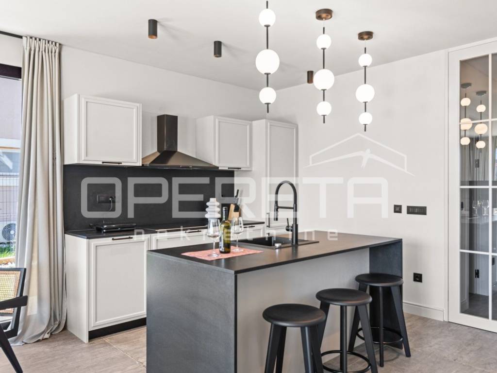 U prizemlju se nalazi komforni, klimatizirani ( 2 klime ) open space- s dnevnim boravkom, dijelom za blagovanje, moderno opremljenom kuhinjom s otokom, iz kojeg se izlazi u vanjski prostor, na ugodnu i natkrivenu terasu.